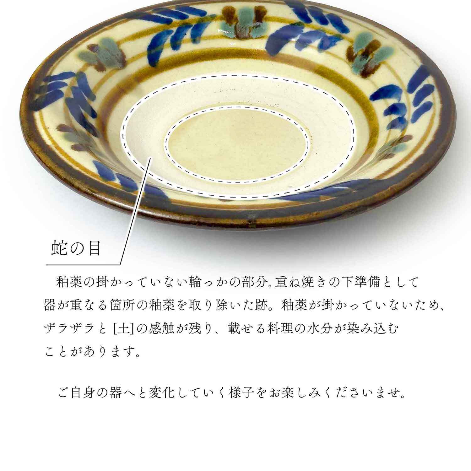 藍色や緑、アメ色の巻唐草がリースのように内側に描かれた華やかなデザインです。