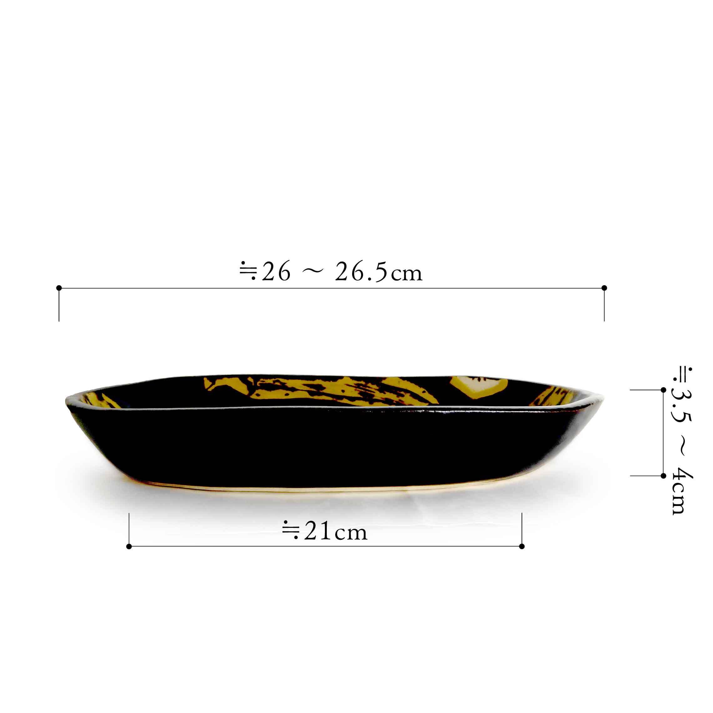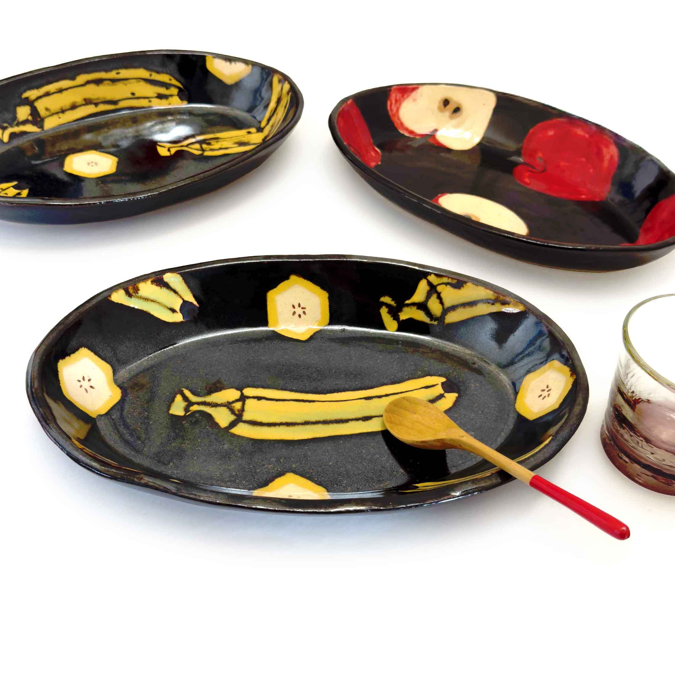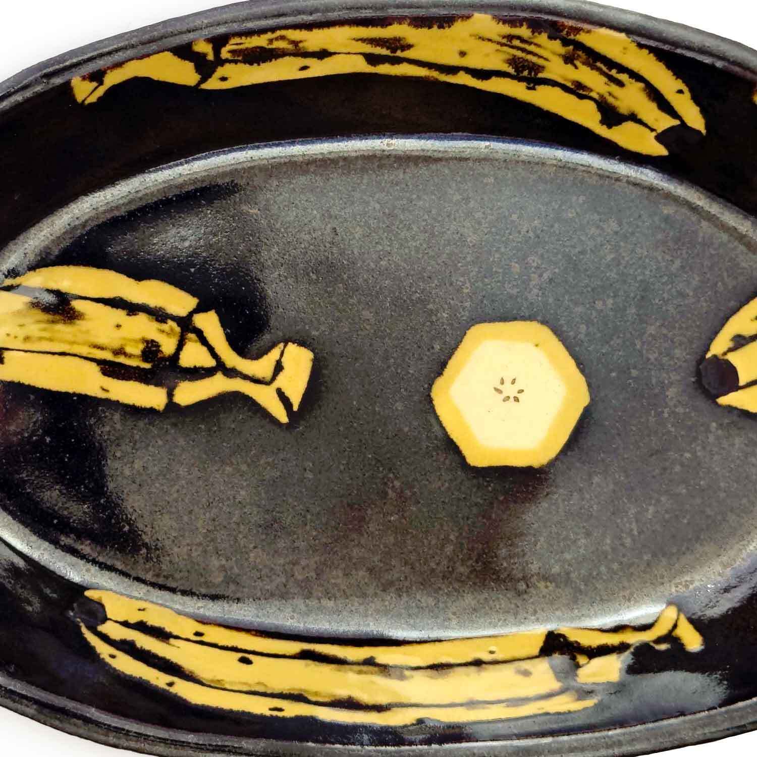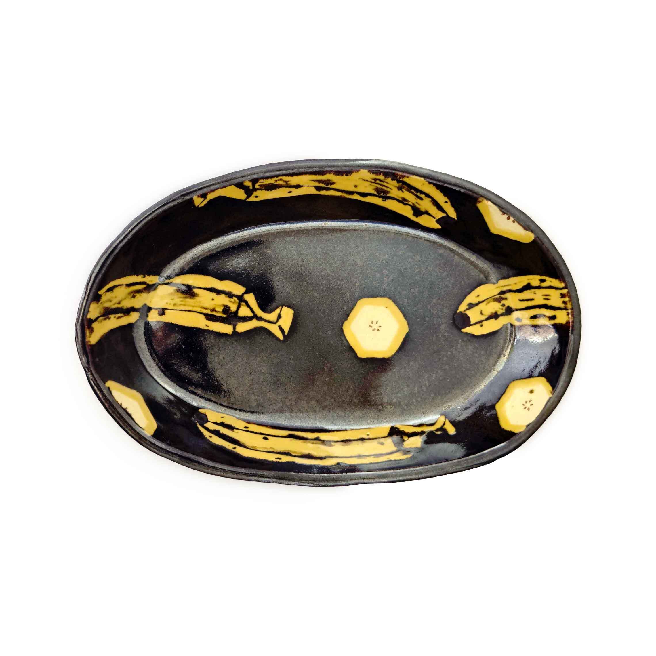 黒褐色が美しい楕円形の器に、黄色の島バナナとその断面が描かれています。