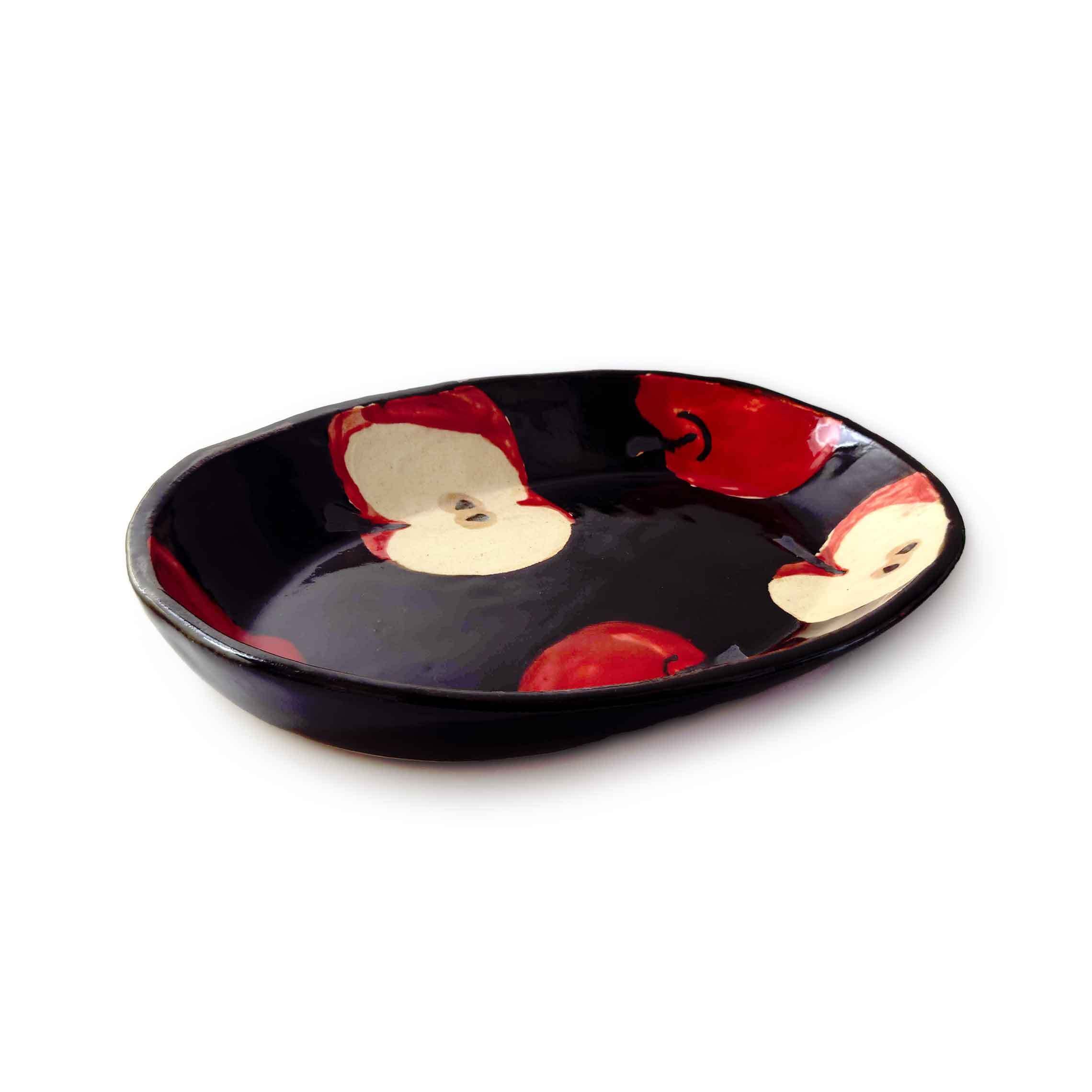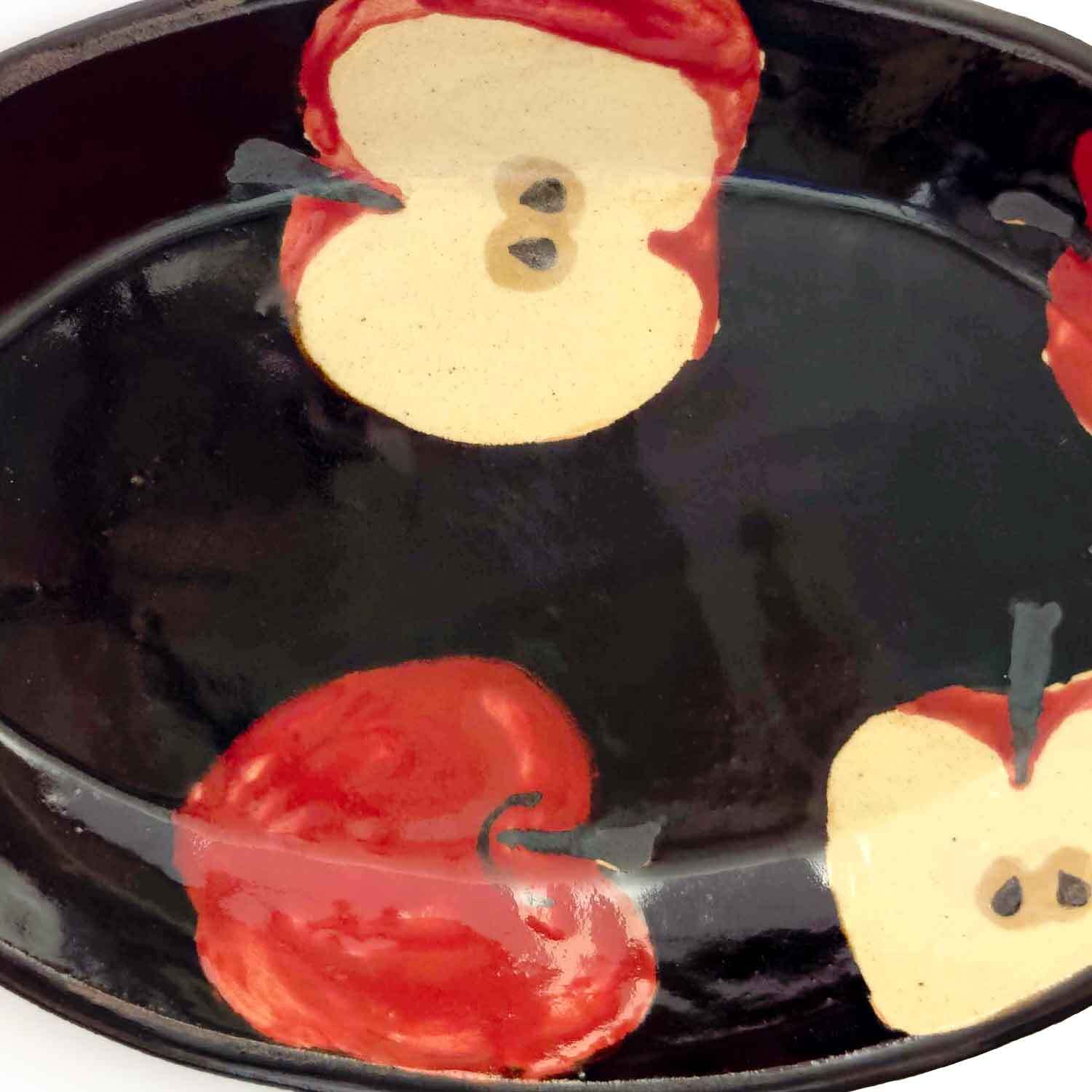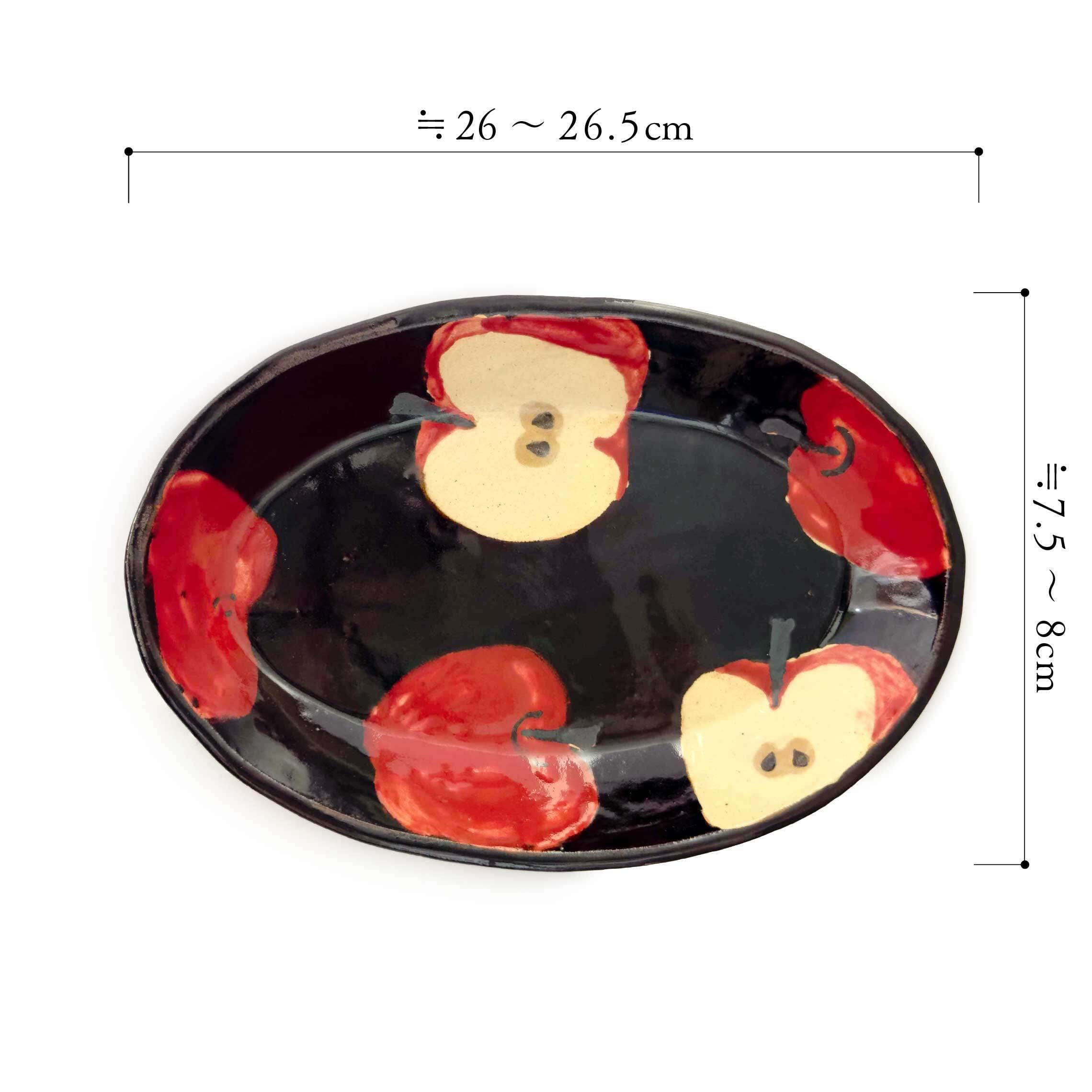 黒褐色が美しい楕円形の器に、りんごとその断面が描かれています。