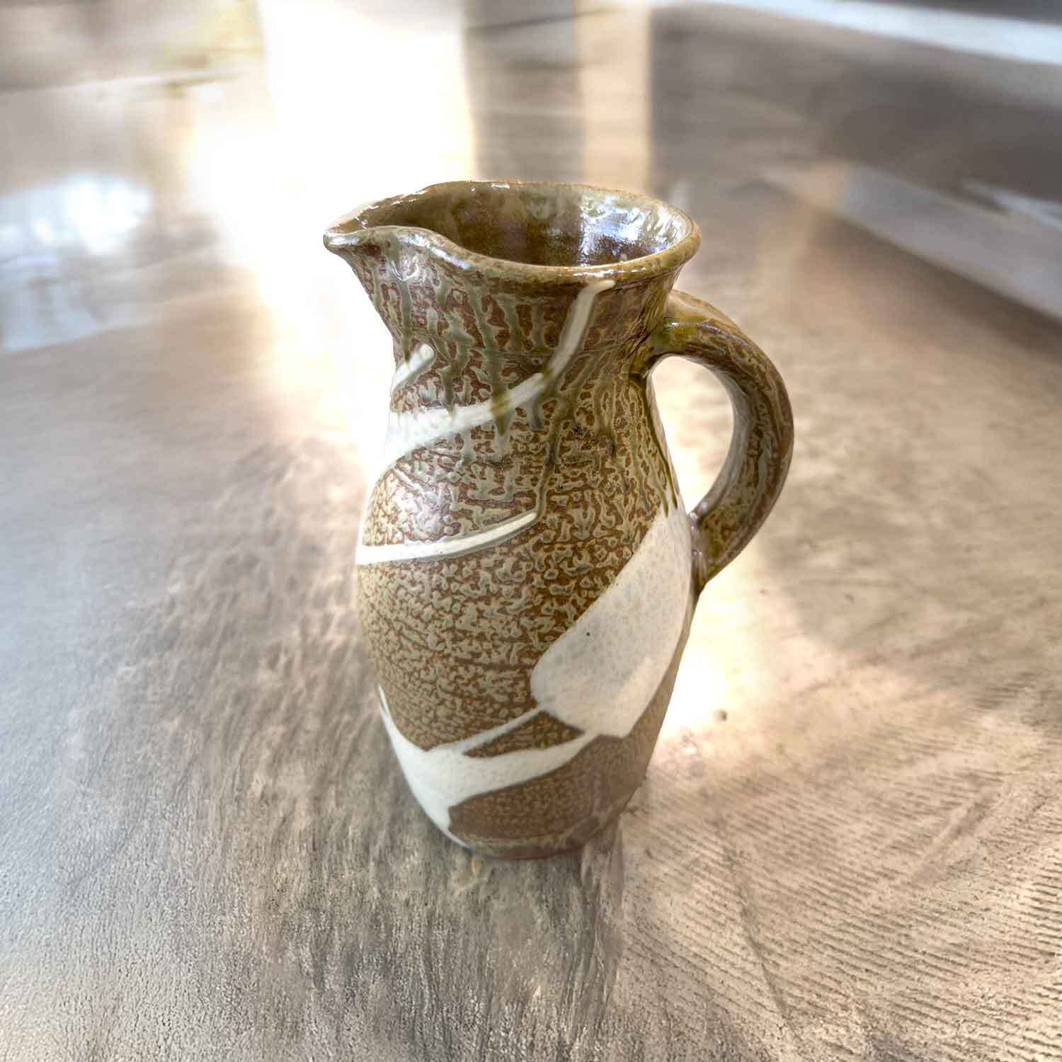 アースカラーの茶を基調に、白や淡い茶色の釉薬が繊細に施されたこのピッチャーは、自然の穏やかさと落ち着きを感じさせます。