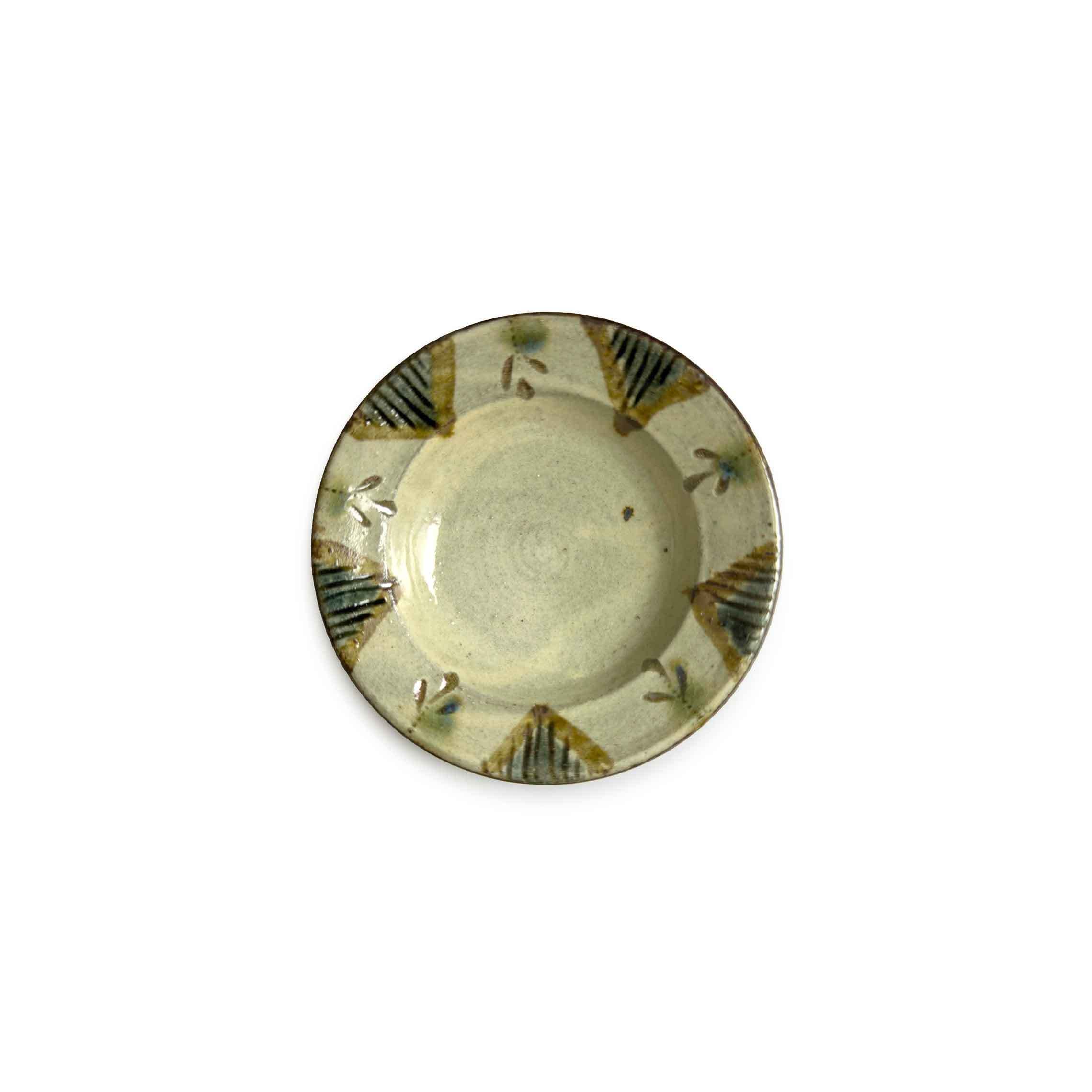 リム部分に描かれているテントのような三角と可愛らしい葉っぱが、ガーランドのようで楽しげな四寸皿 です。