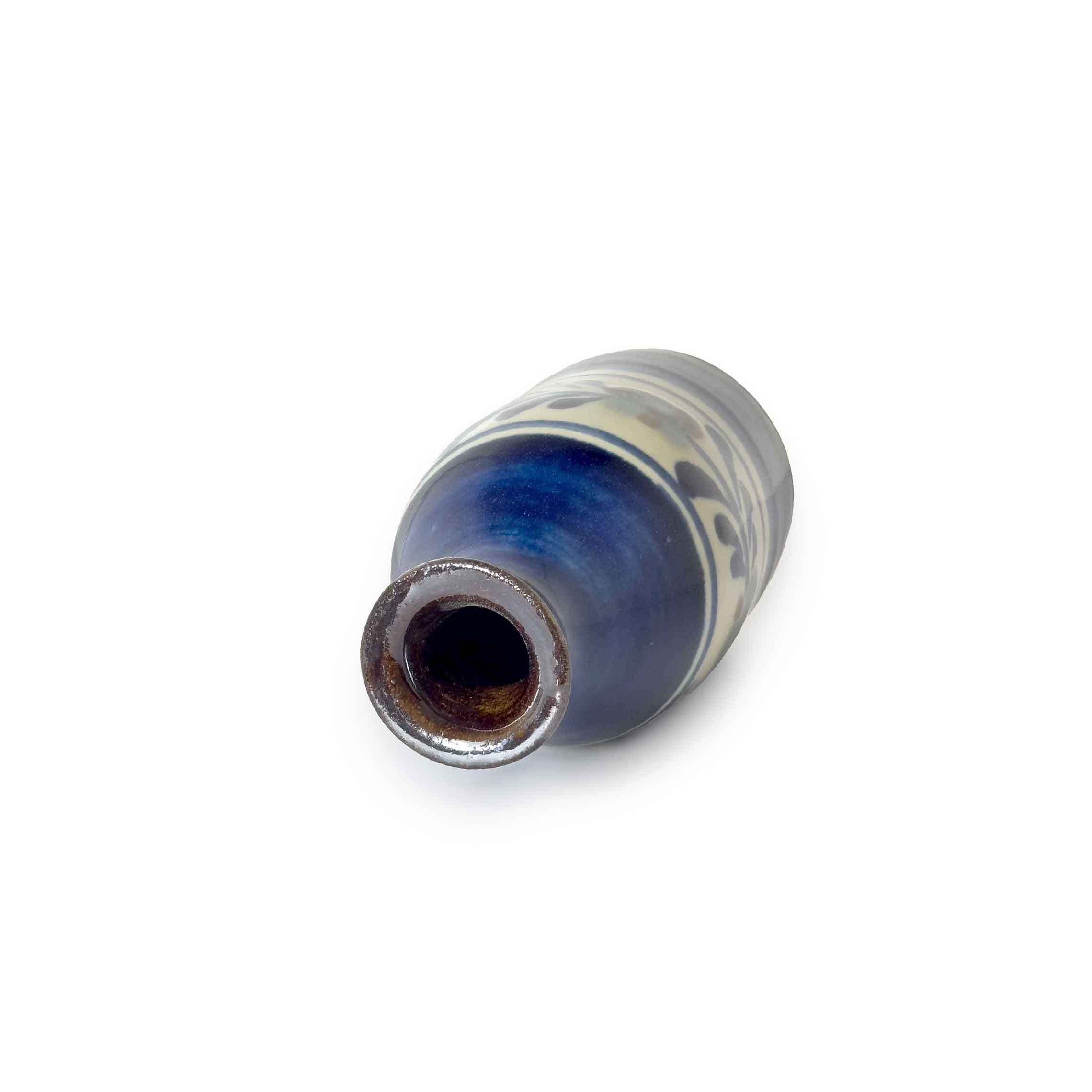 深みのある藍色を基調に、中央には白地に植物をモチーフにした手描きの絵付けが施されています。