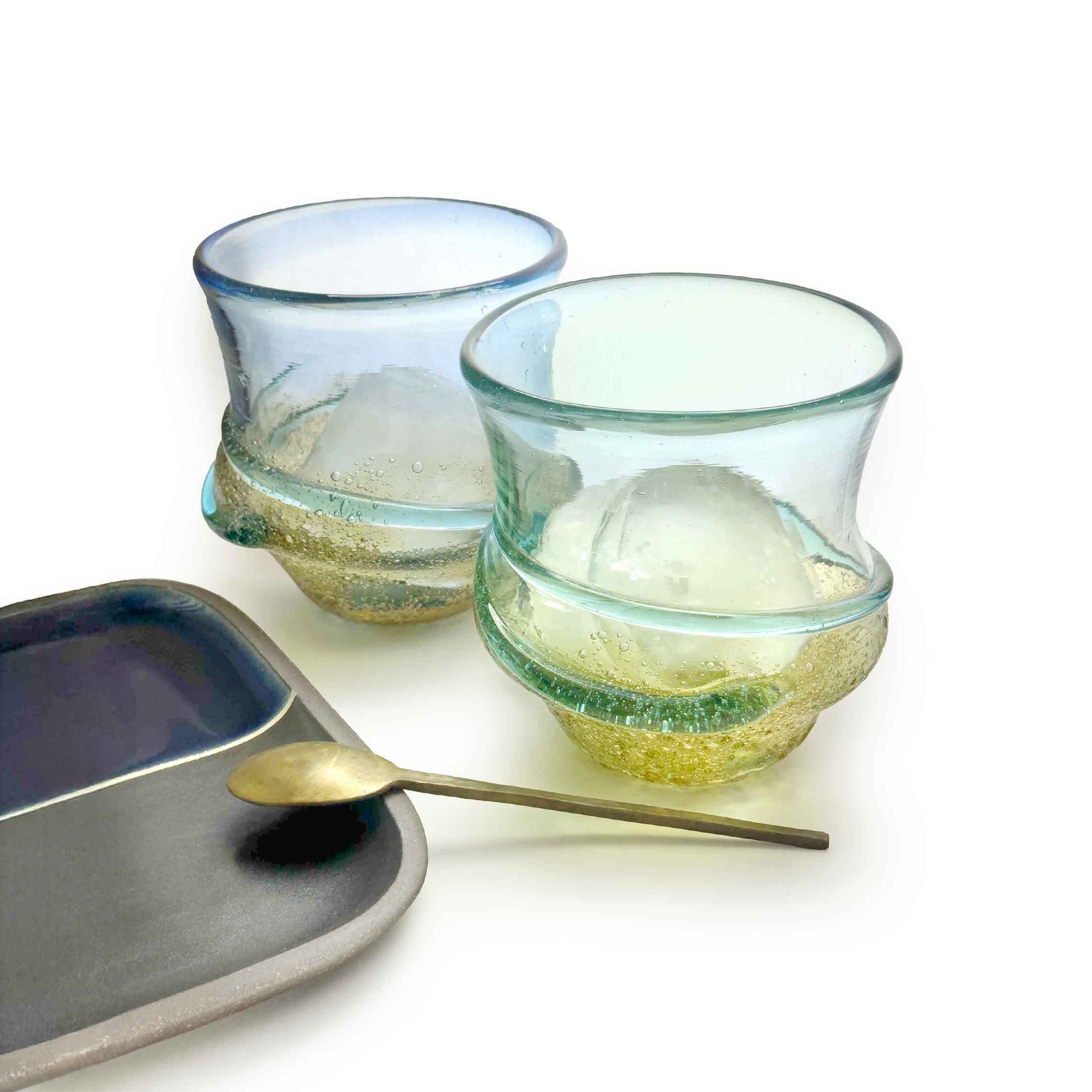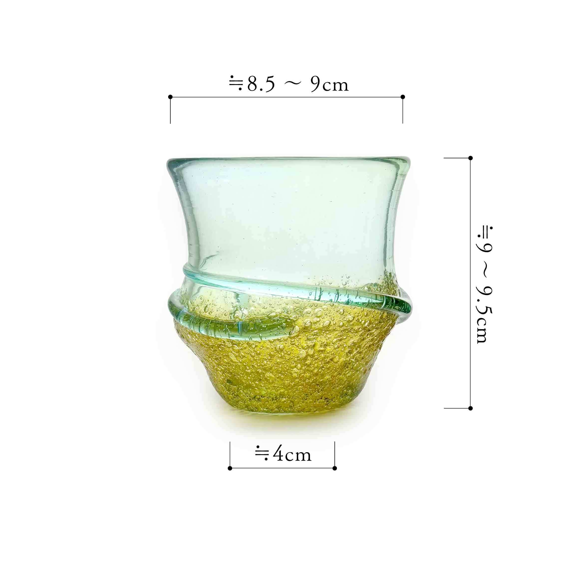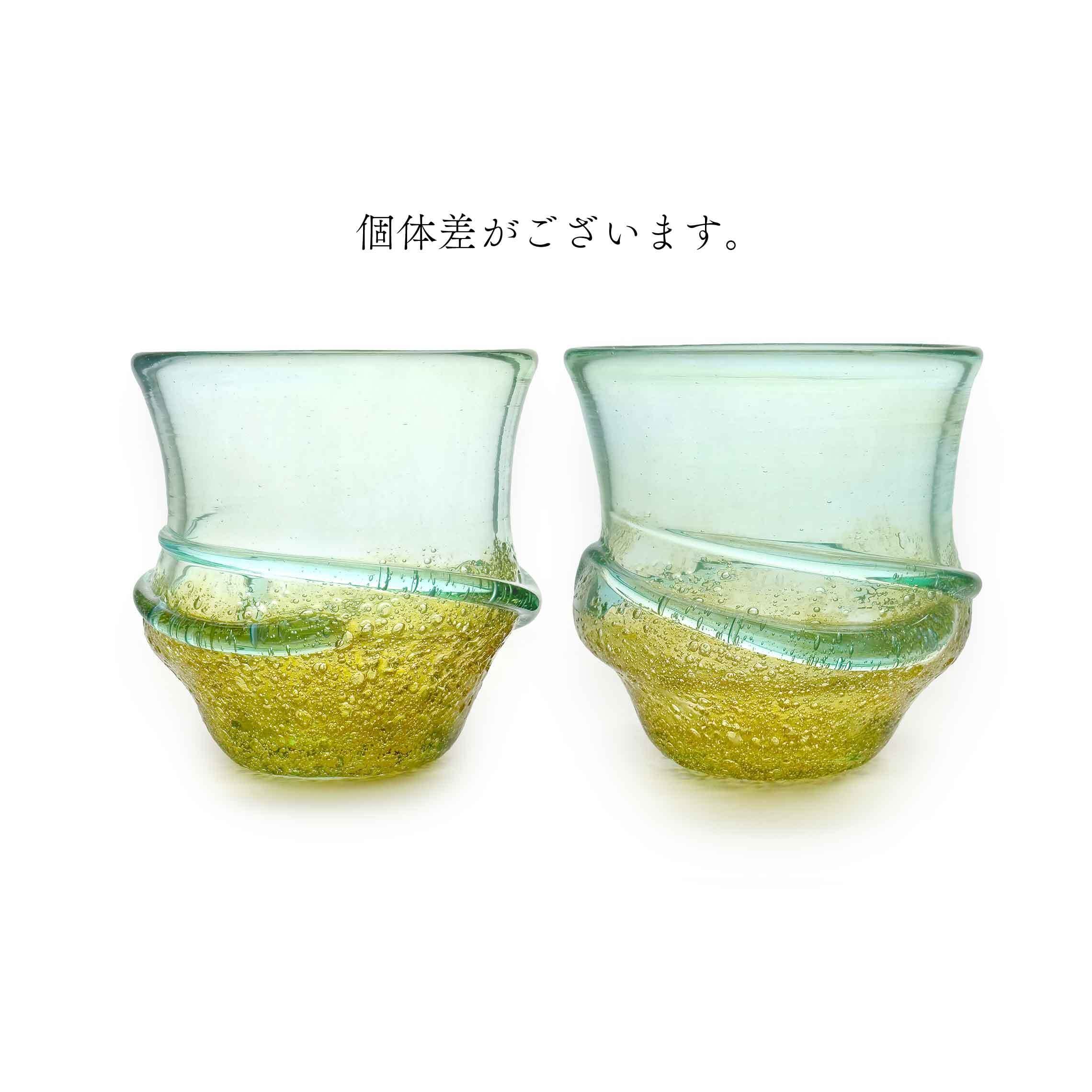 グラスの下部には繊細な気泡が散りばめられ、光を受けるたびに金粉をまとったような輝きを放ちます。華やかな気泡とは異なり、柔らかな曲線が優美さを際立たせ、爽やかなグリーンと水色の中間色が清々しさを添えています。