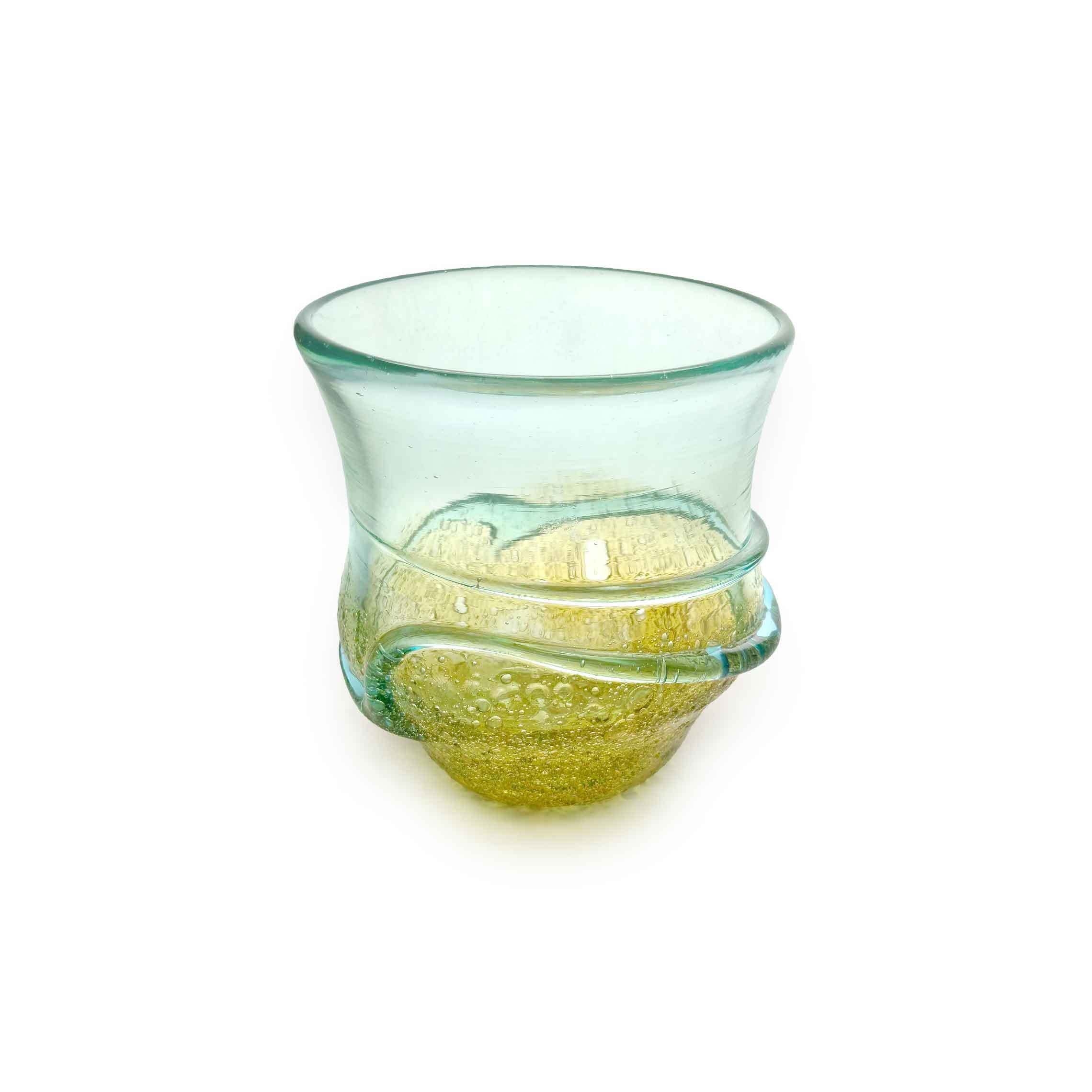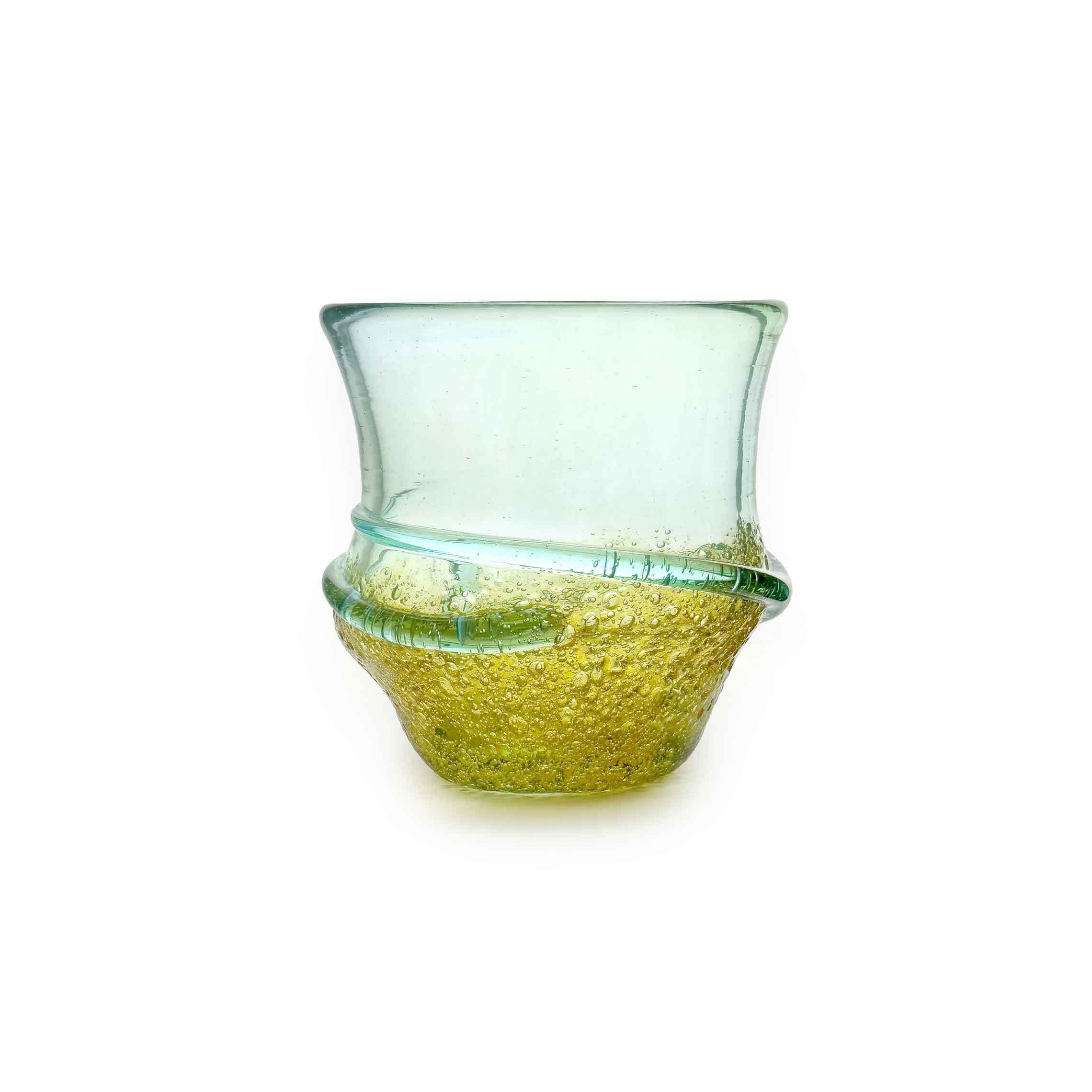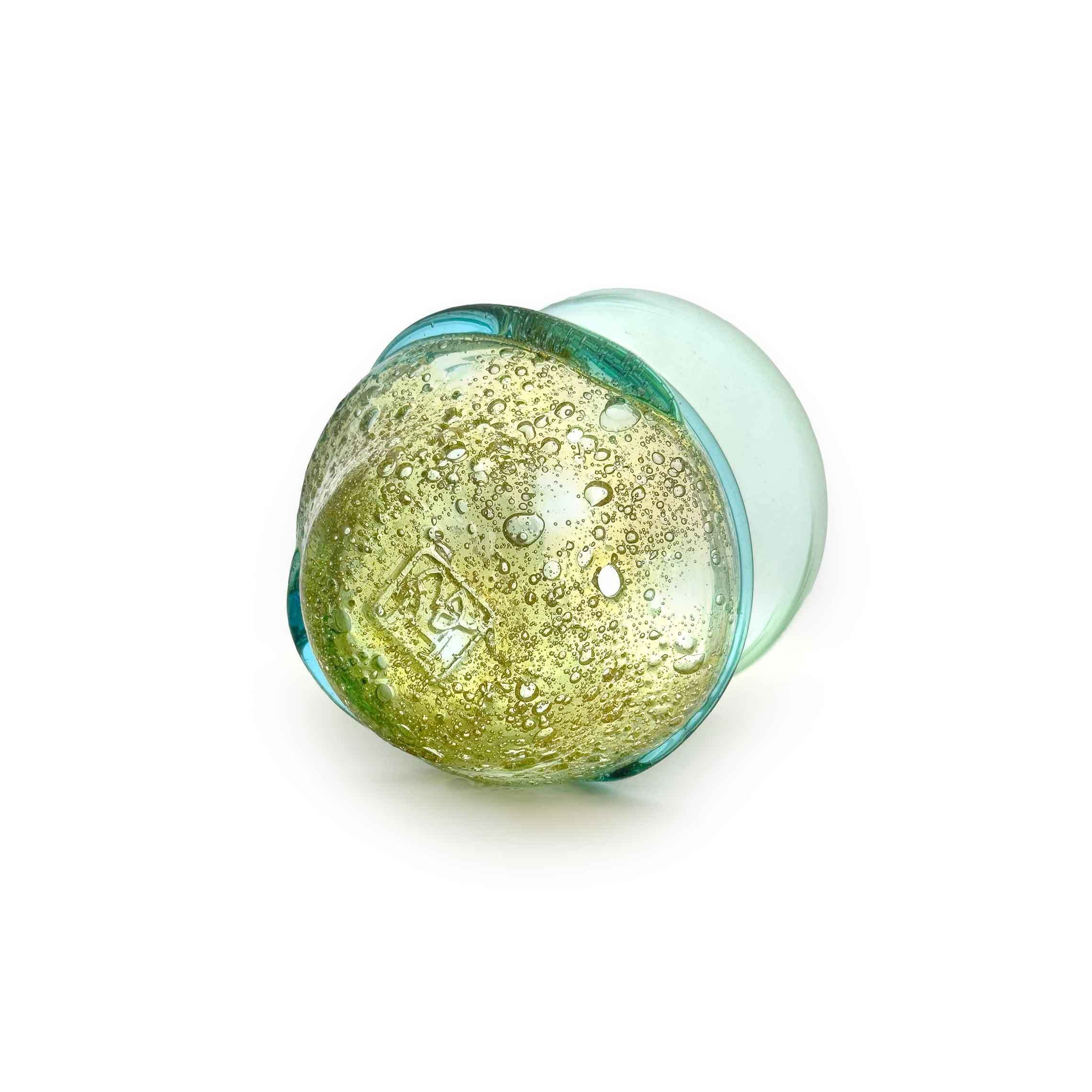 グラスの下部には繊細な気泡が散りばめられ、光を受けるたびに金粉をまとったような輝きを放ちます。華やかな気泡とは異なり、柔らかな曲線が優美さを際立たせ、爽やかなグリーンと水色の中間色が清々しさを添えています。