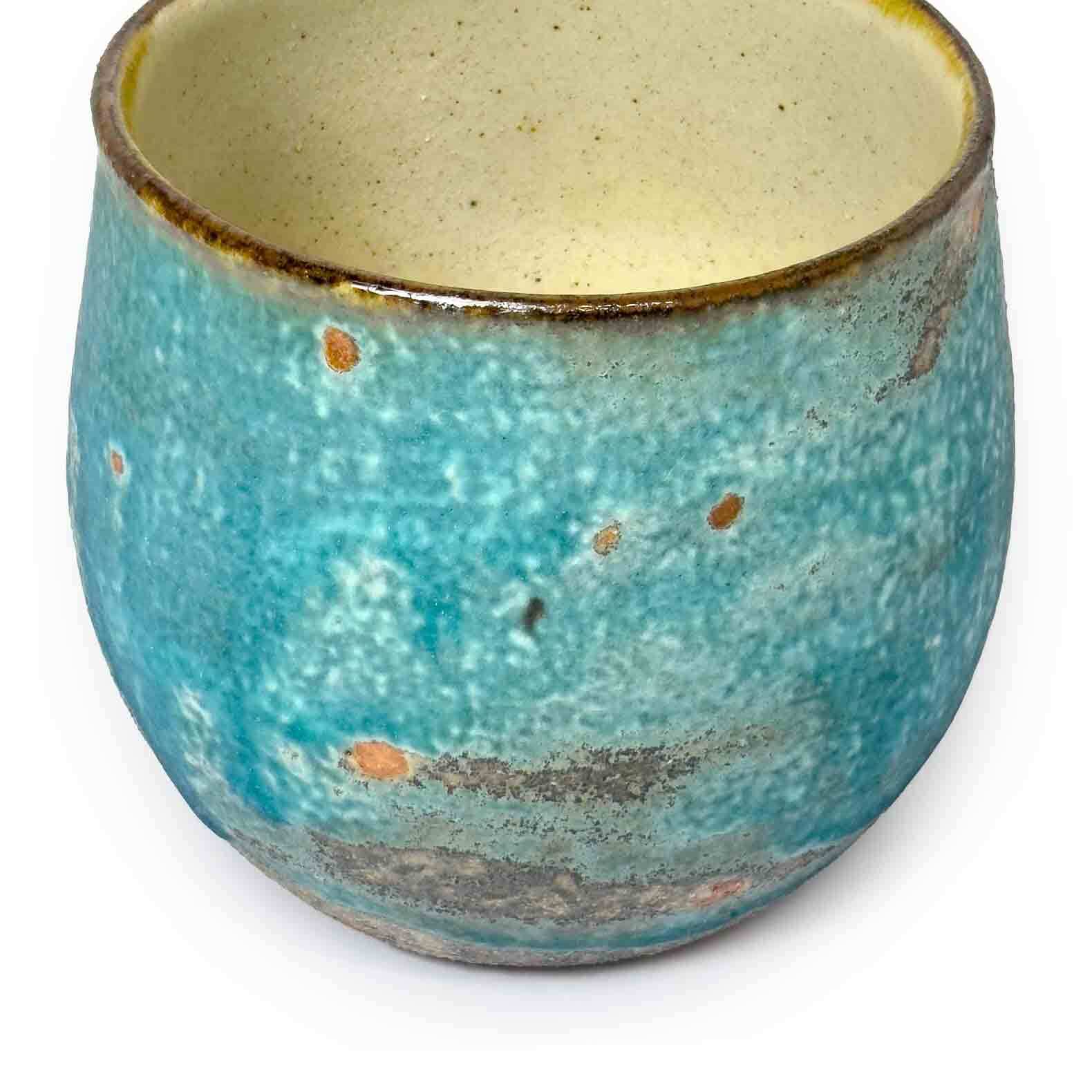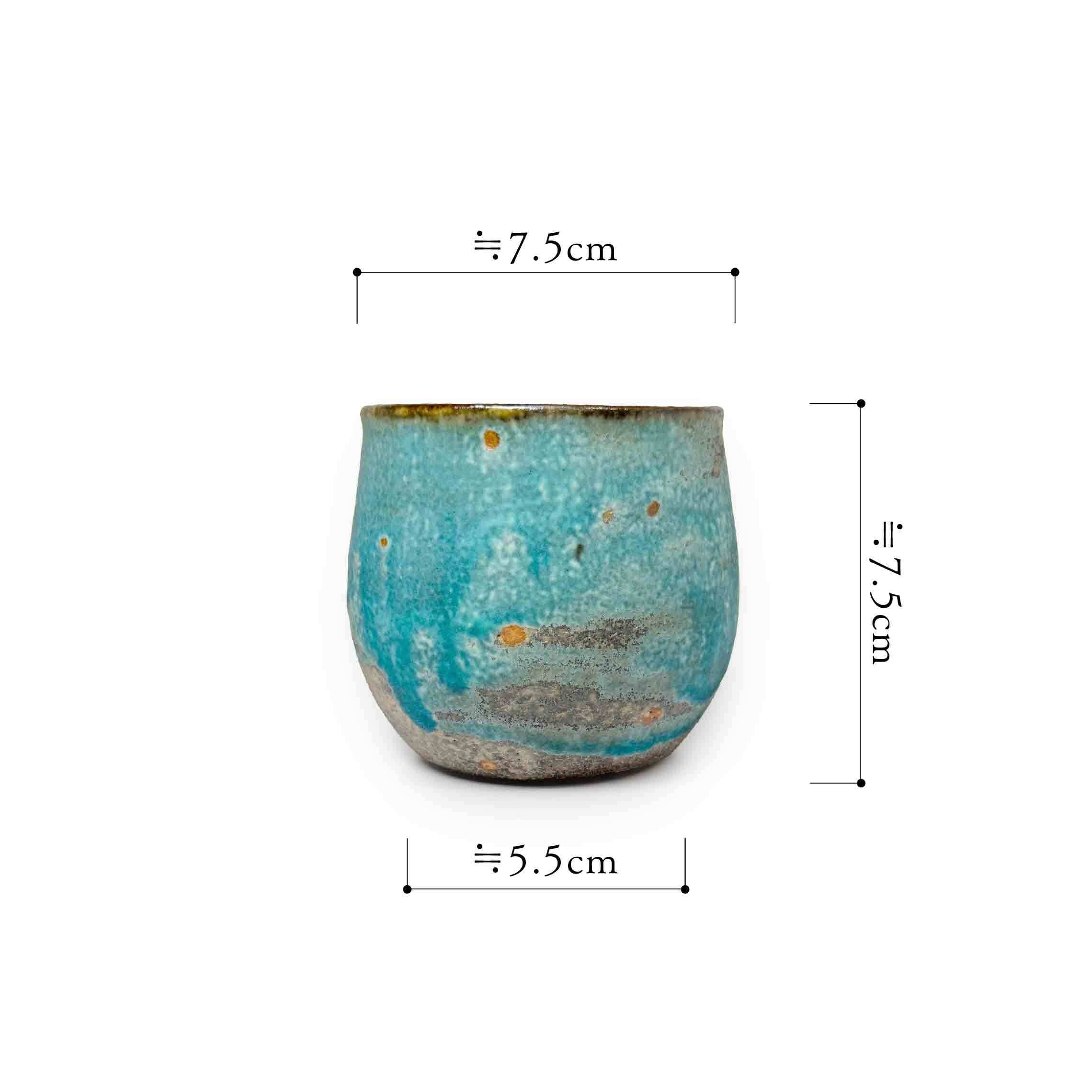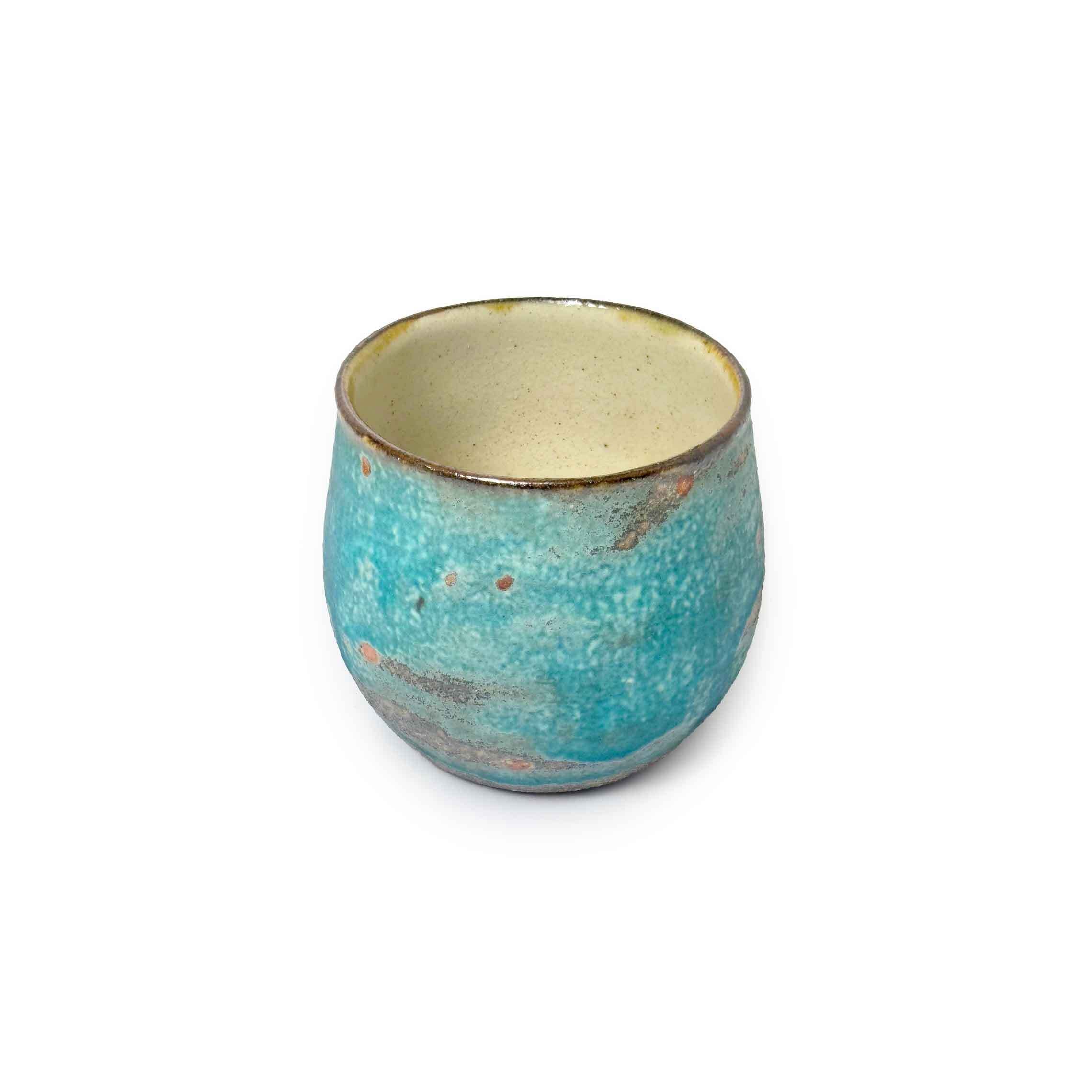 丸みを帯びた柔らかなフォルムに、トルコブルーを基調とした釉薬が広がるカップ。