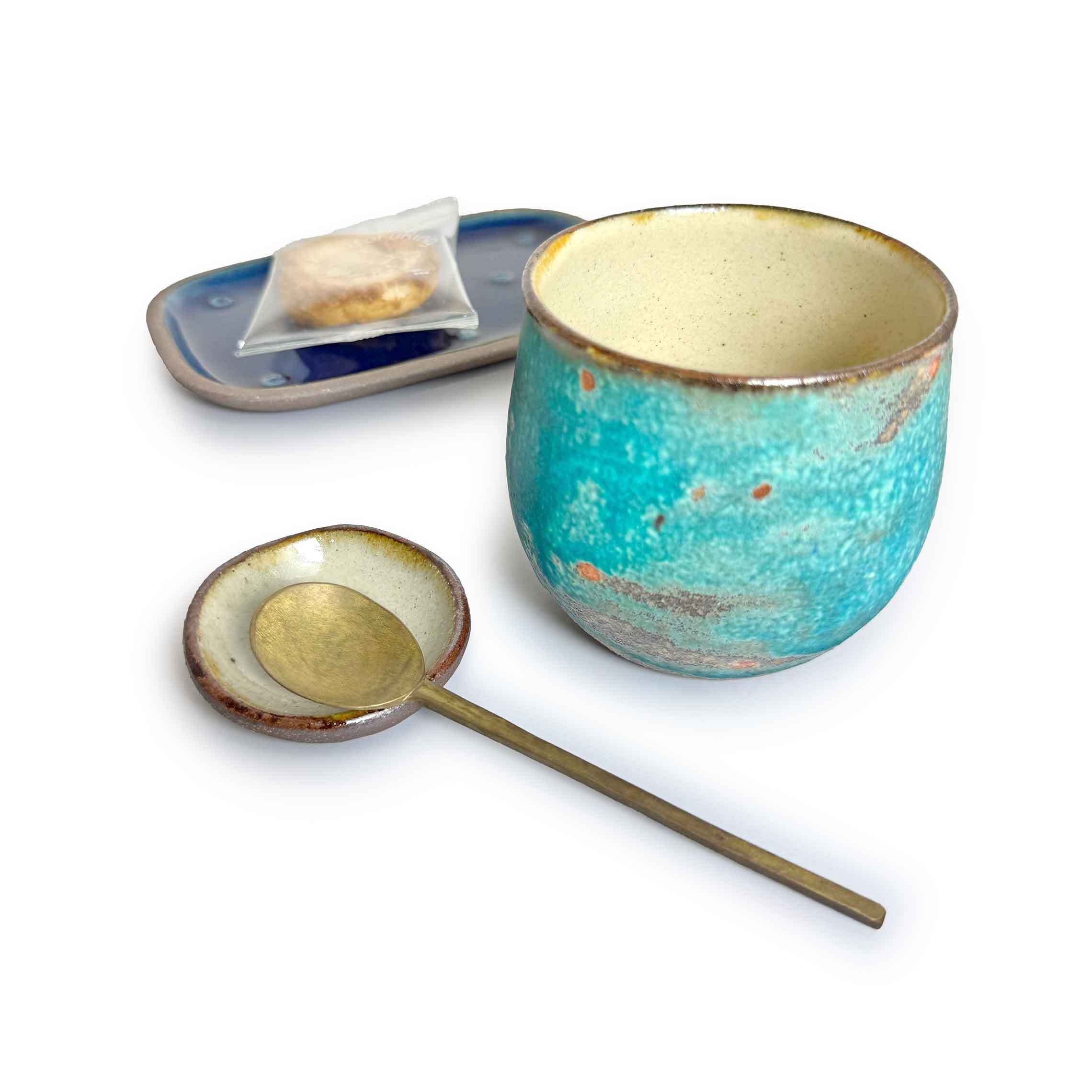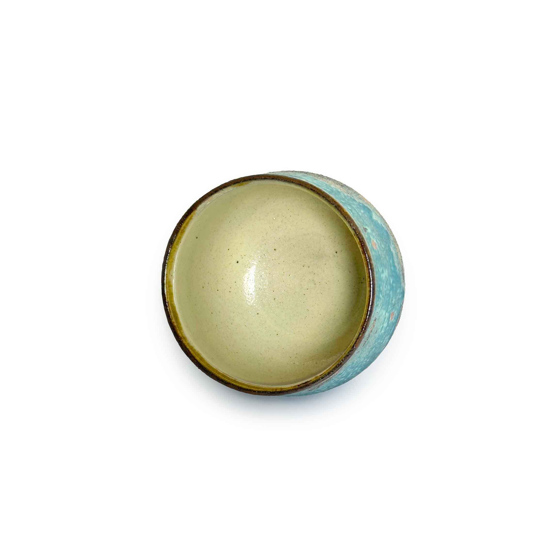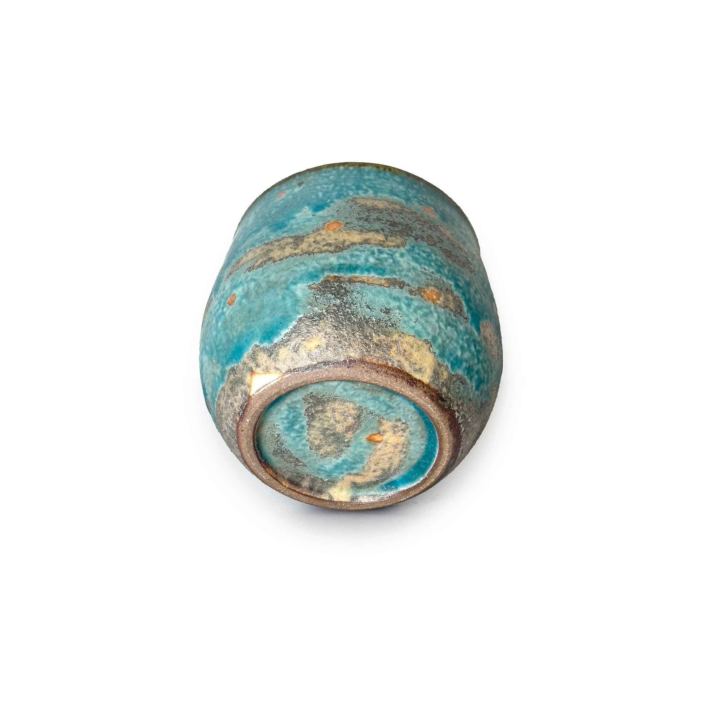 丸みを帯びた柔らかなフォルムに、トルコブルーを基調とした釉薬が広がるカップ。