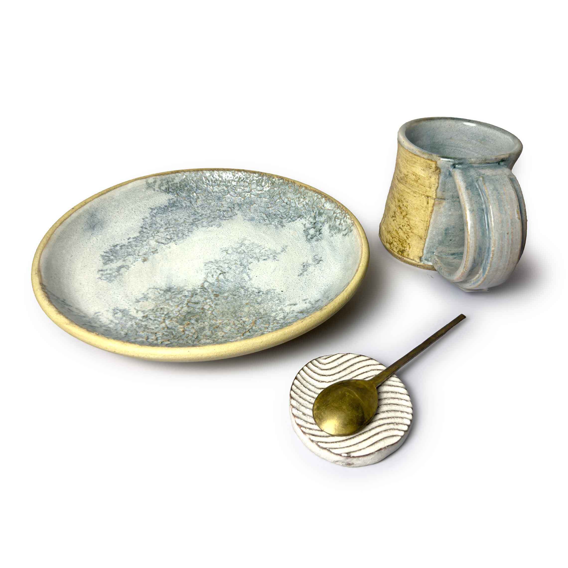 浅く広がる丸皿は、縁がほどよく立ち上がり、盛り付けを美しく引き立てる形状です。内側には釉薬の結晶が生み出す繊細な模様が広がり、やわらかな光沢をまといながらも落ち着いた趣を感じさせます。その表情は、まるで自然の風景を切り取ったかのよう。外側はさらりとした心地よい手触りで、素朴な温もりを添えています。