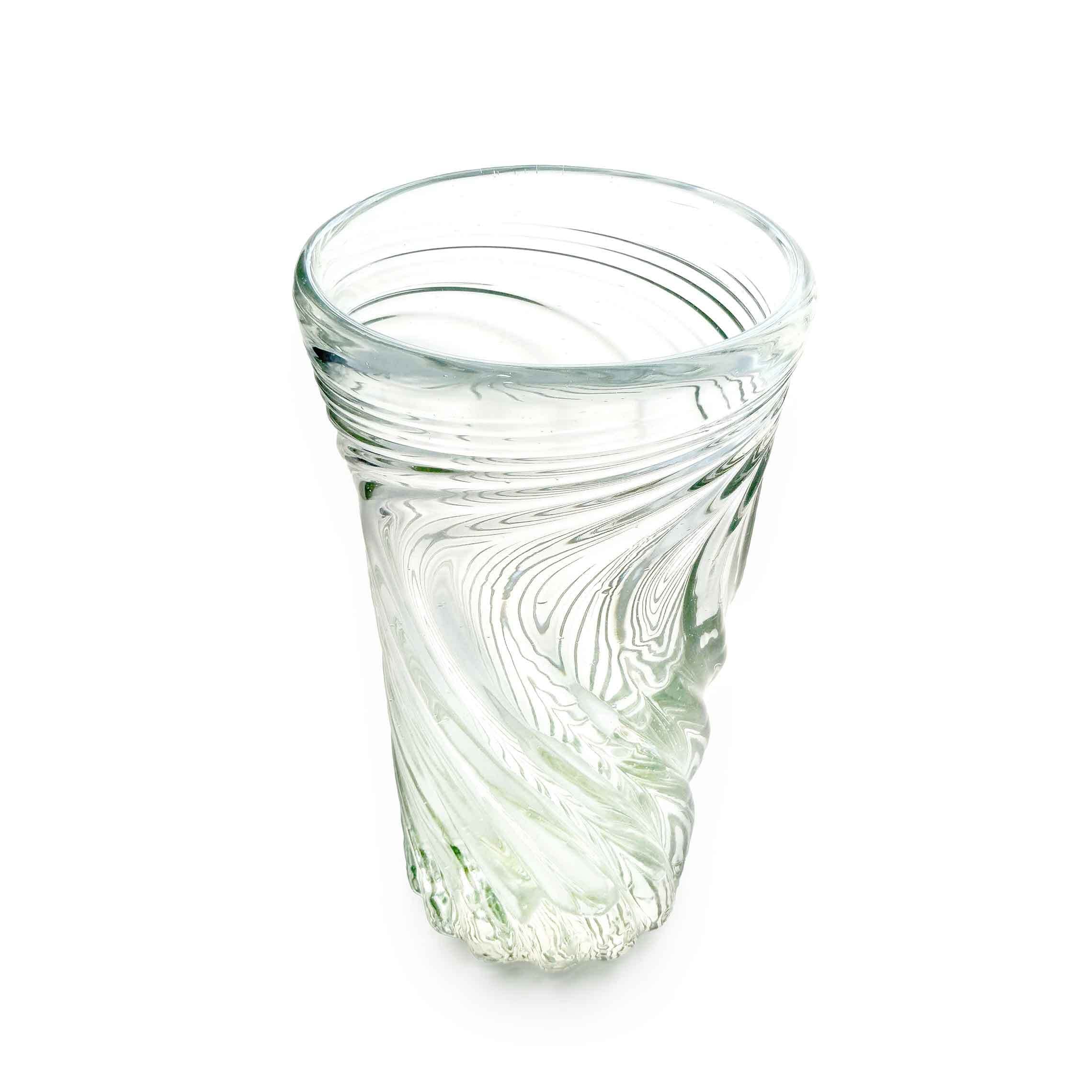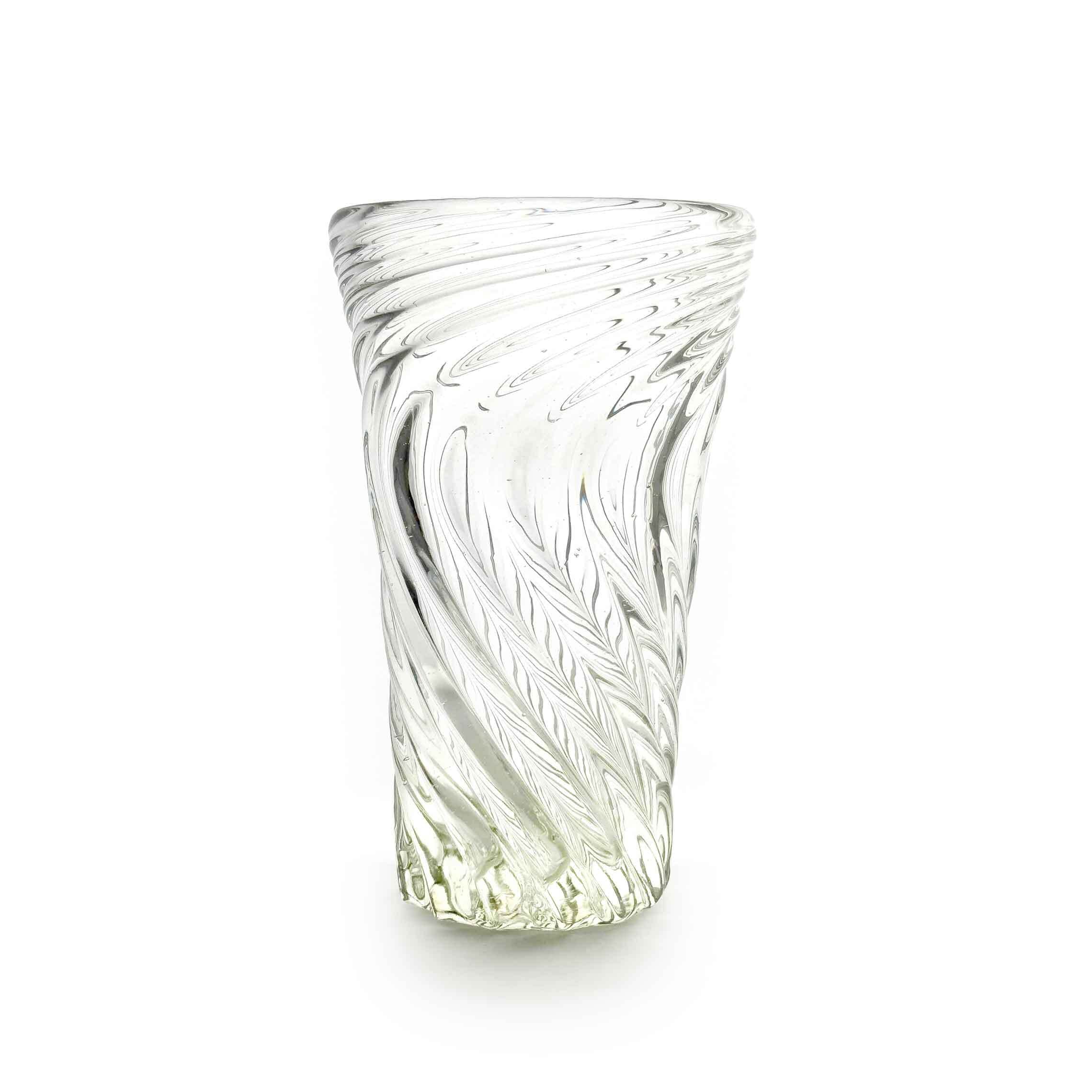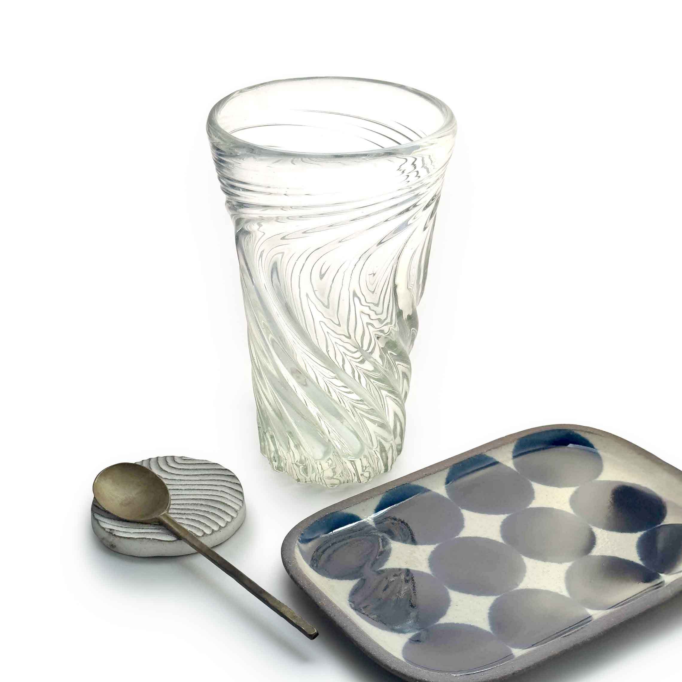 ガラスには流れるようなラインが施され、光を受けると美しい陰影が生まれます。表面は滑らかでありながら、模様による屈折が高級感を演出します。