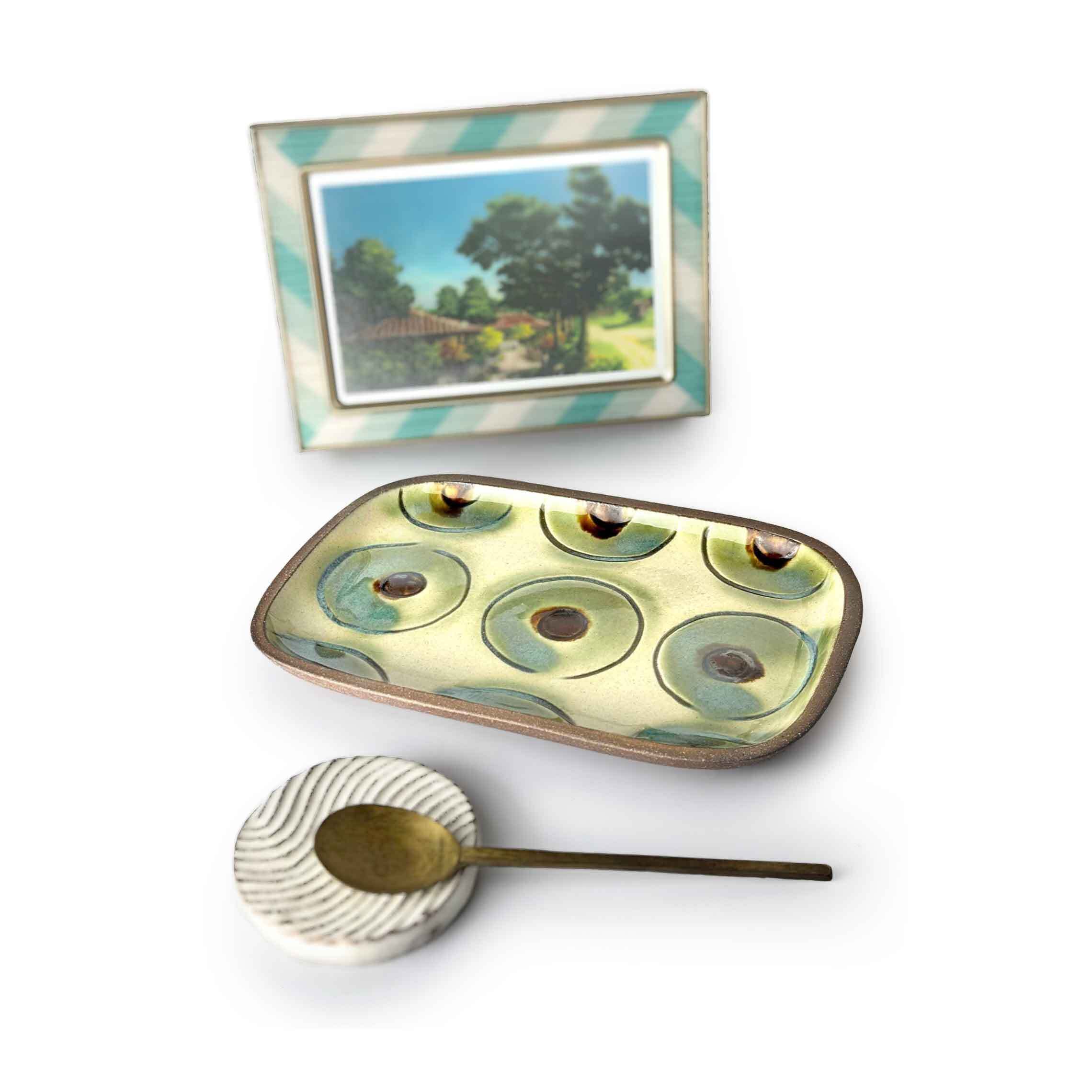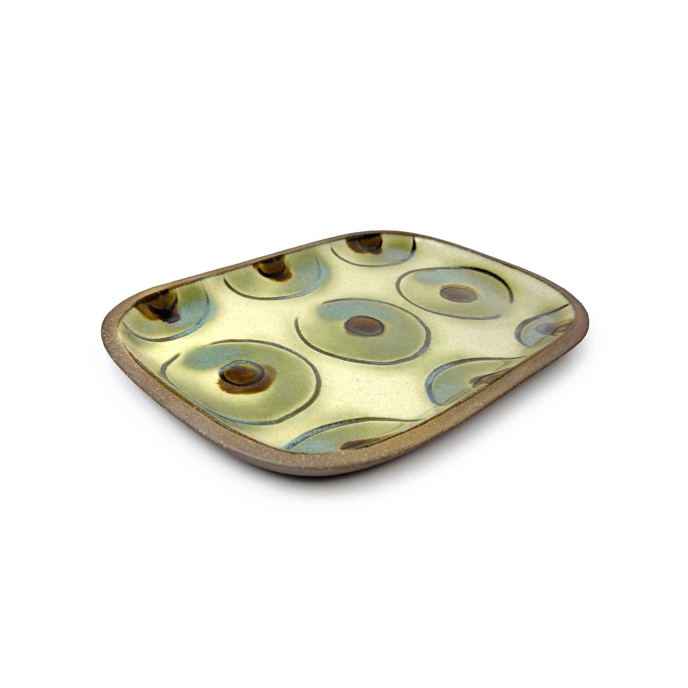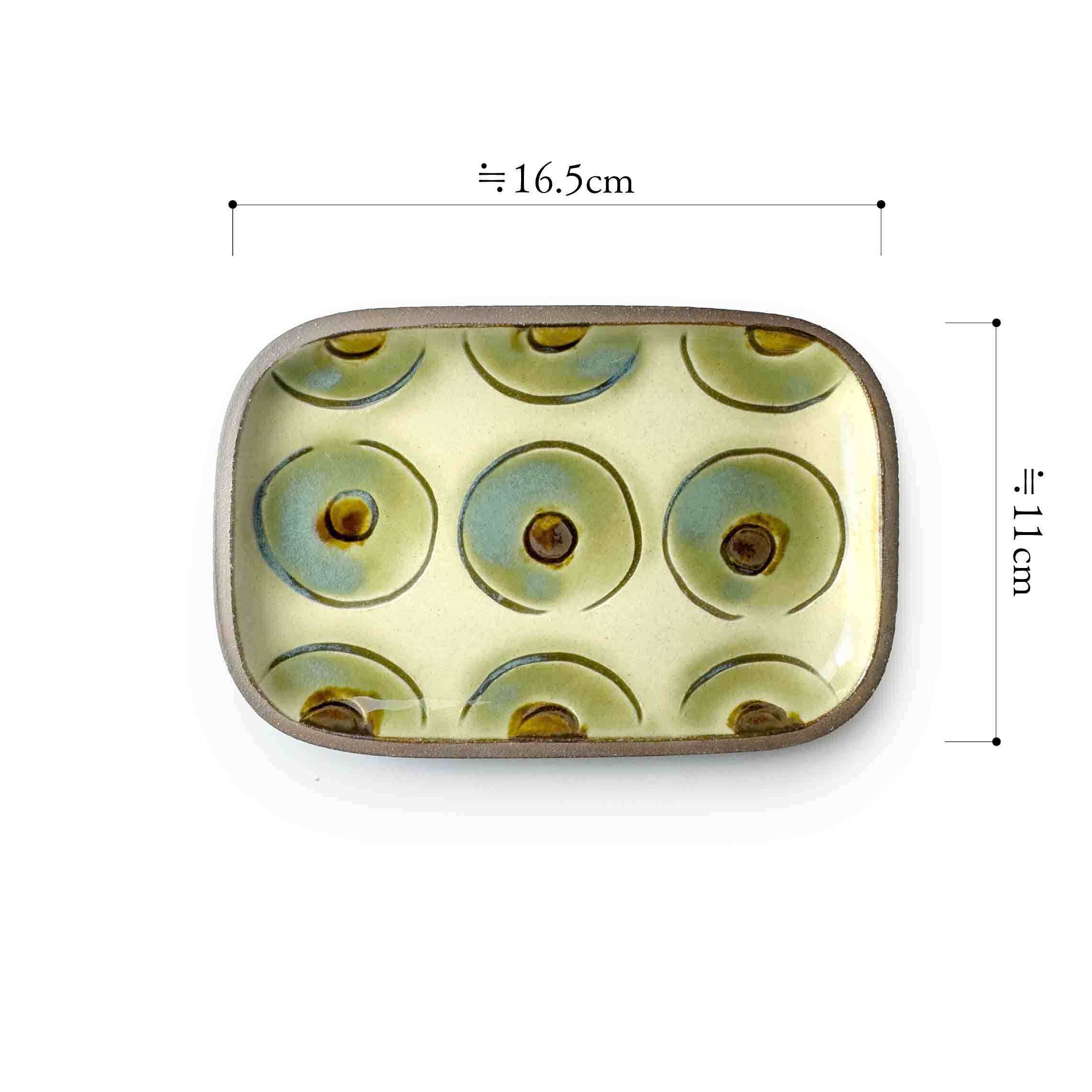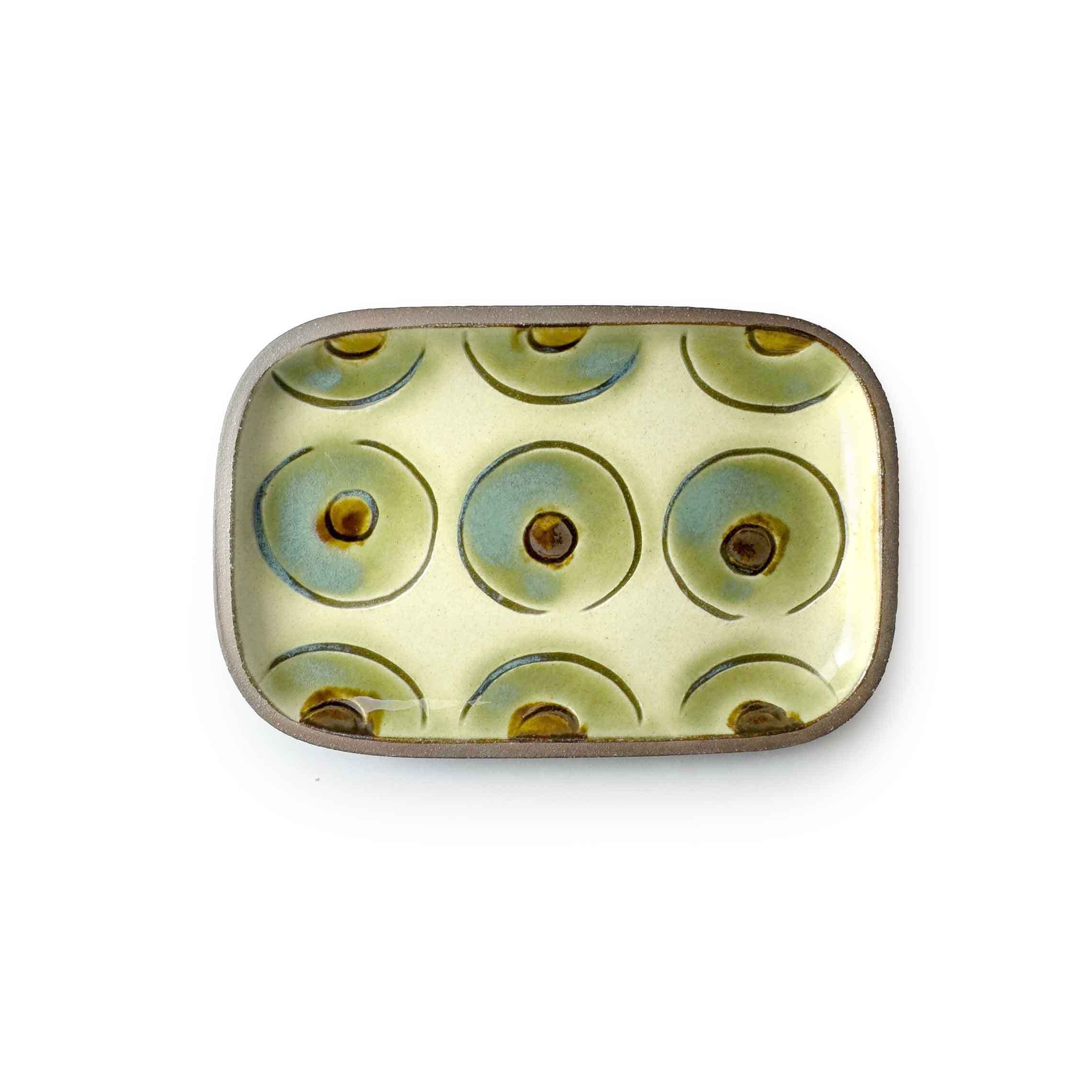 淡い黄緑色の釉薬をベースに、円形の模様が規則的に並んでいます。円の中心には茶色の点があり、周囲に青緑のぼかしが入っていて、まるでりんごを上から見た姿を抽象化したような、遊び心のあるデザイン。