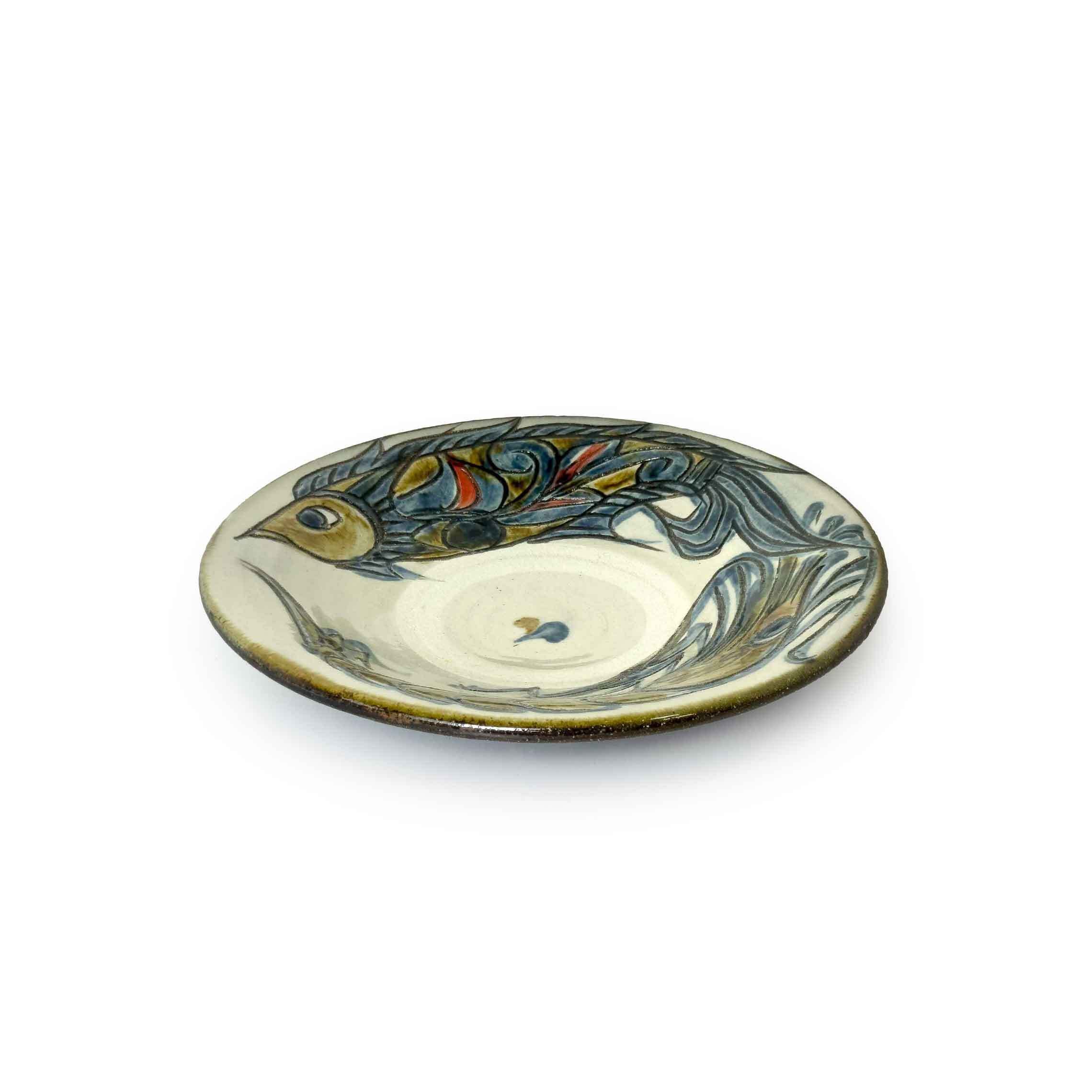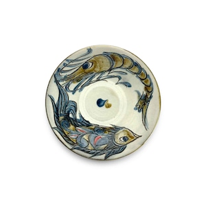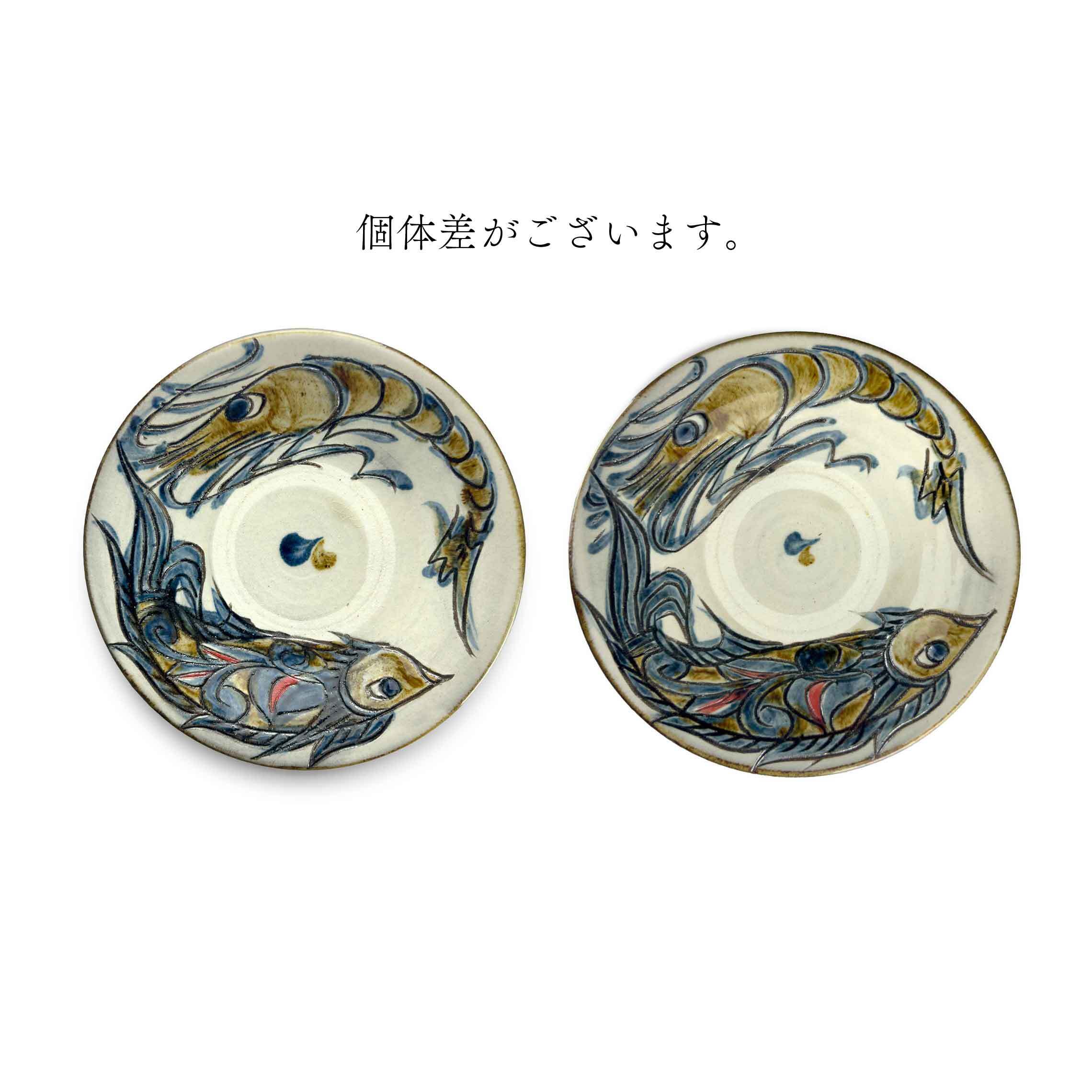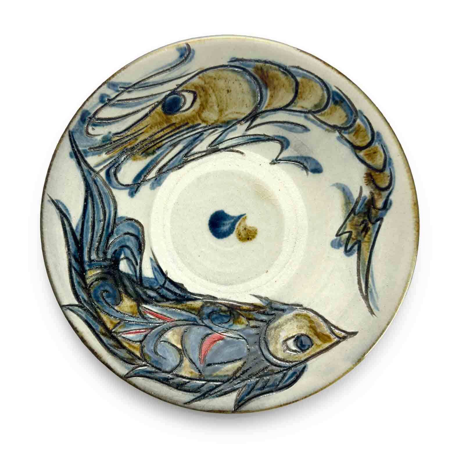 やちむん特有のどっしりとした佇まいとお皿の中に絵付けされた魚紋と海老紋が、勢いある線彫りの曲線でささやかな立体感を作り出し、まるでお皿の中を泳いでいるような躍動感を醸し出しています。
