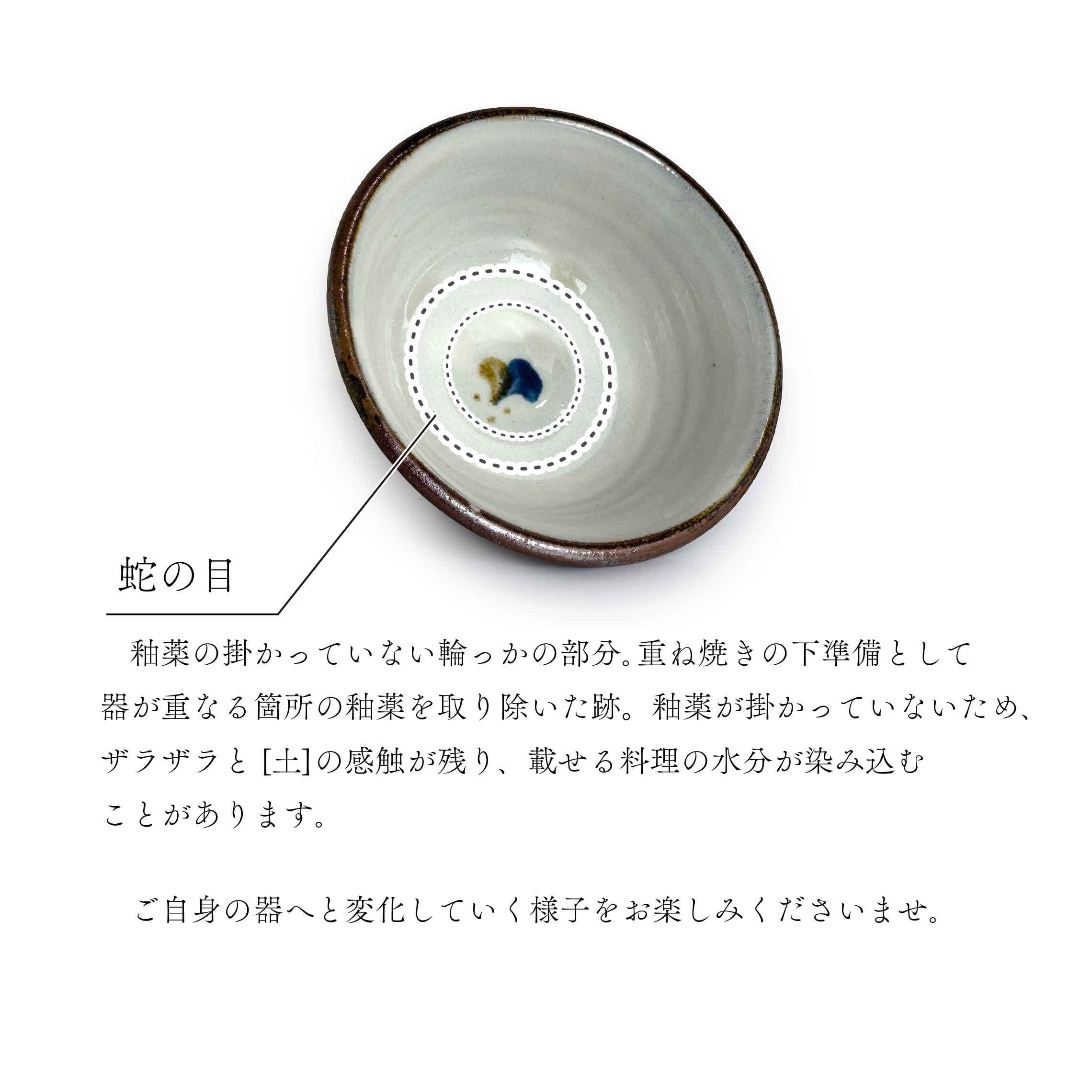 【蛇の目】の箇所は釉薬が掛かっておらず、素地(無釉)の面から、水分や油分が染み込むことで、シミや変色・におい移りがおこる場合があります。