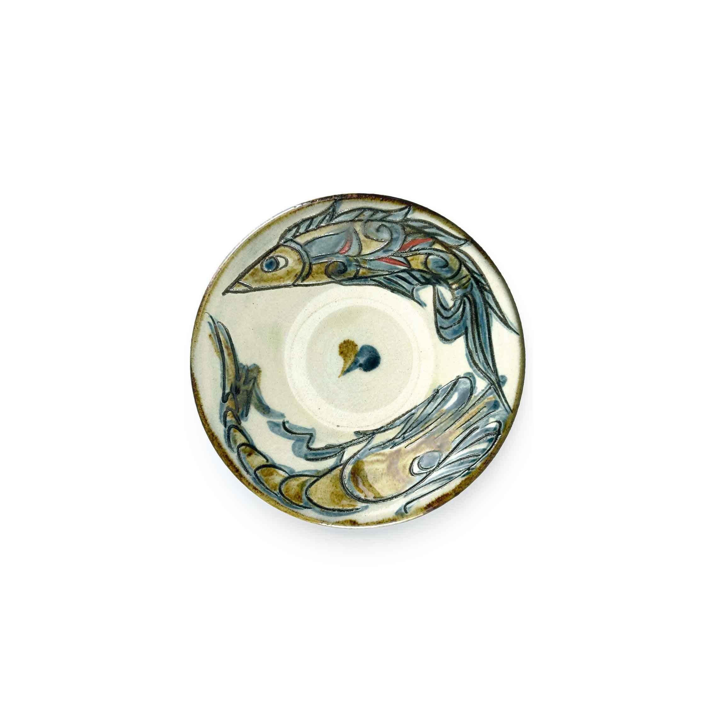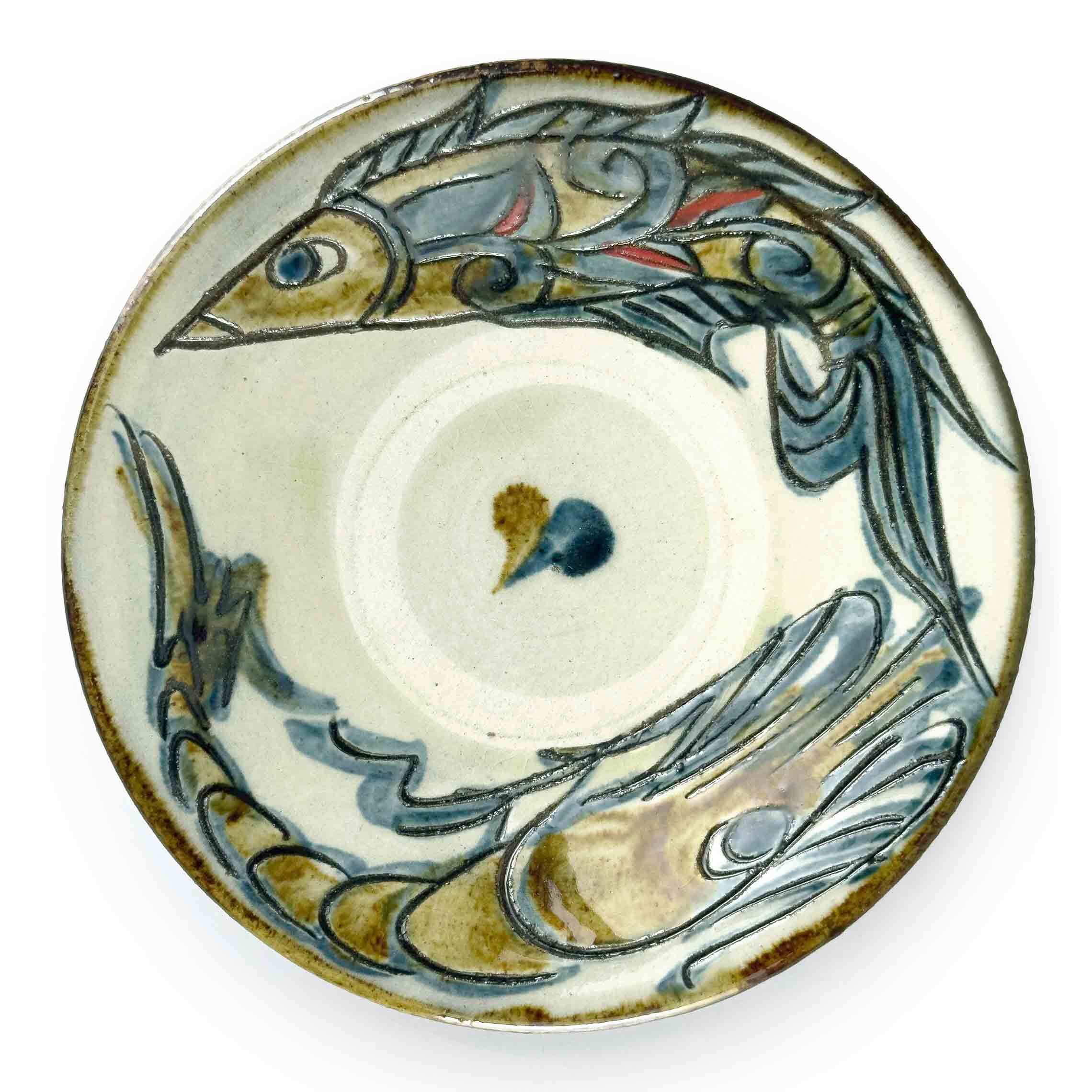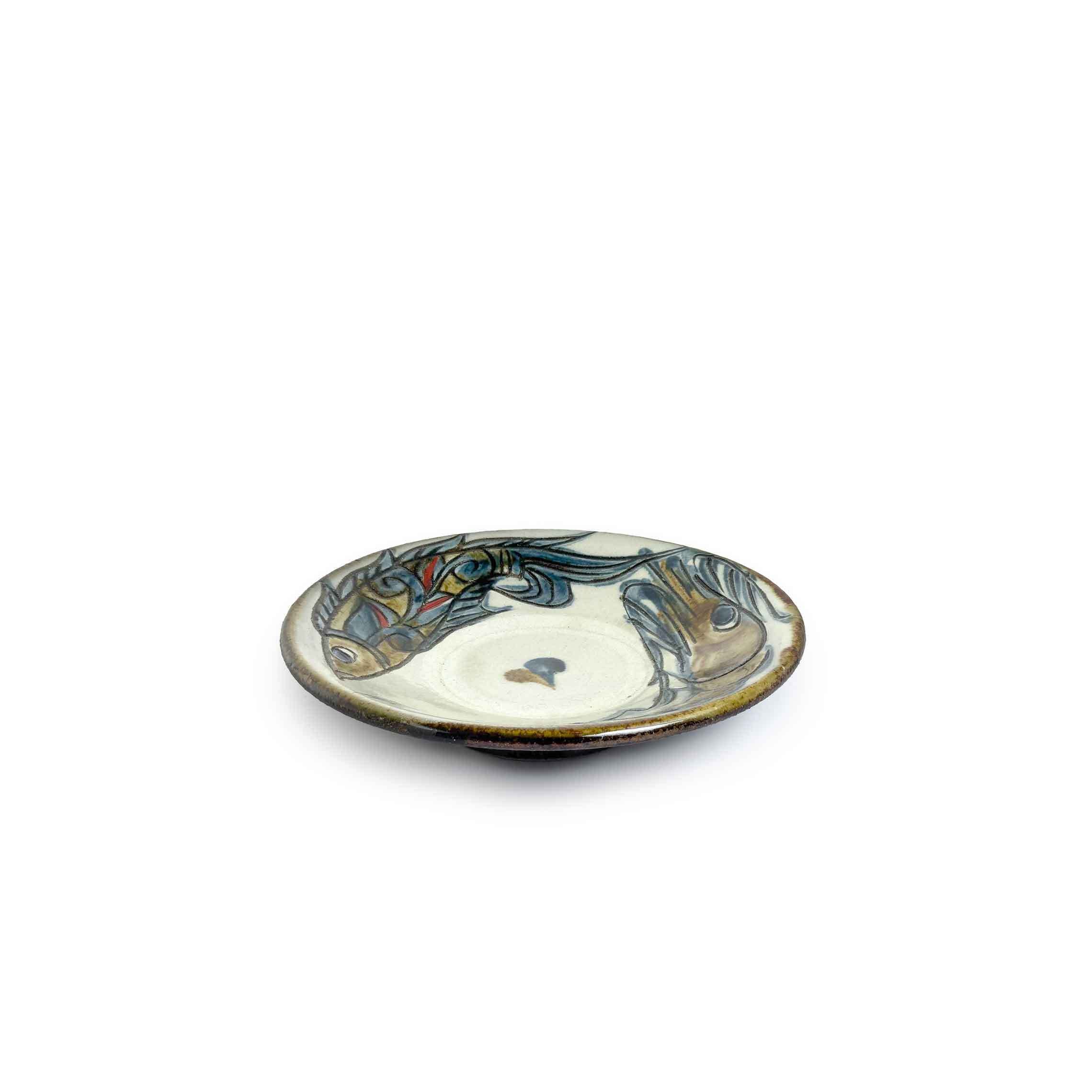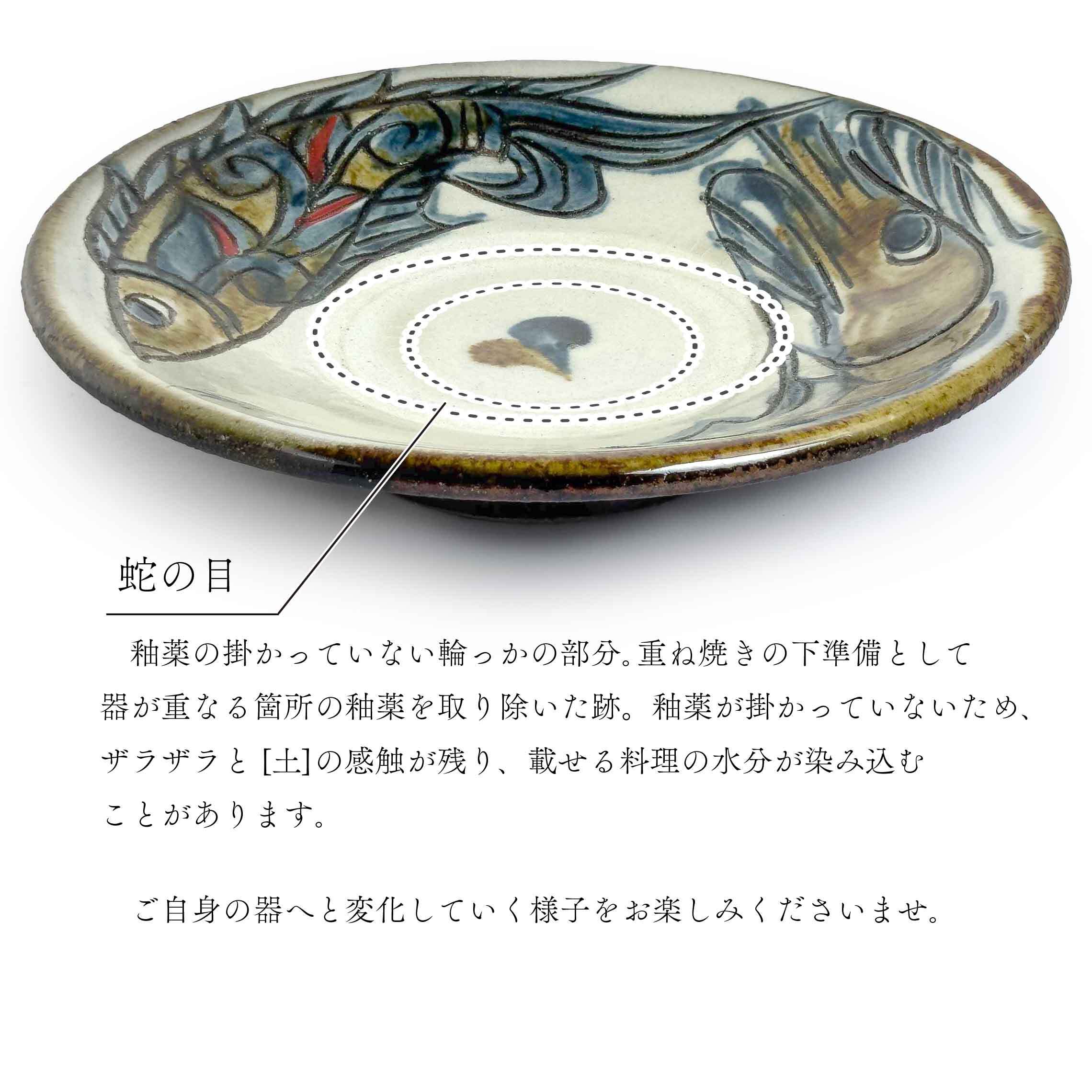 やちむん特有のどっしりとした佇まいとお皿の中に絵付けされた魚紋が、勢いある線彫りの曲線でささやかな立体感を作り出し、まるでお皿の中を泳いでいるような躍動感を醸し出しています。