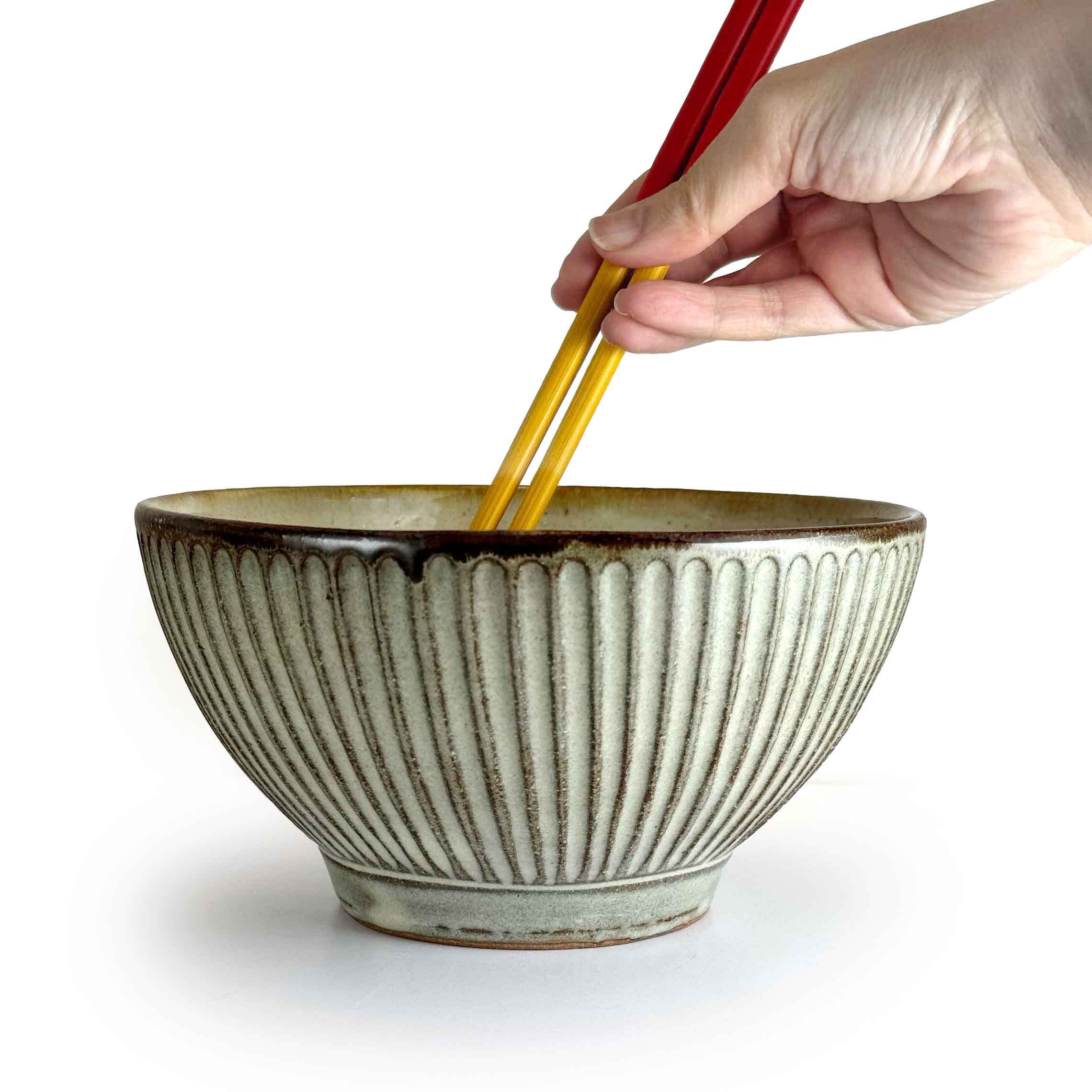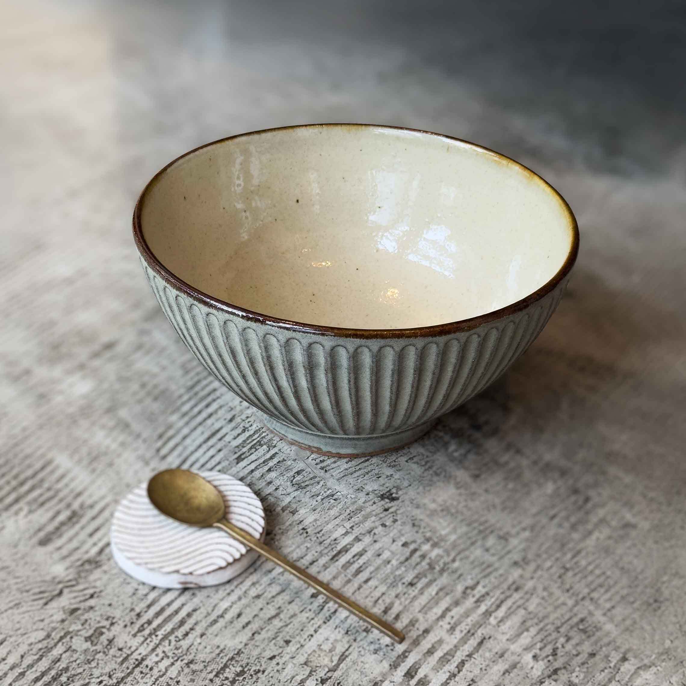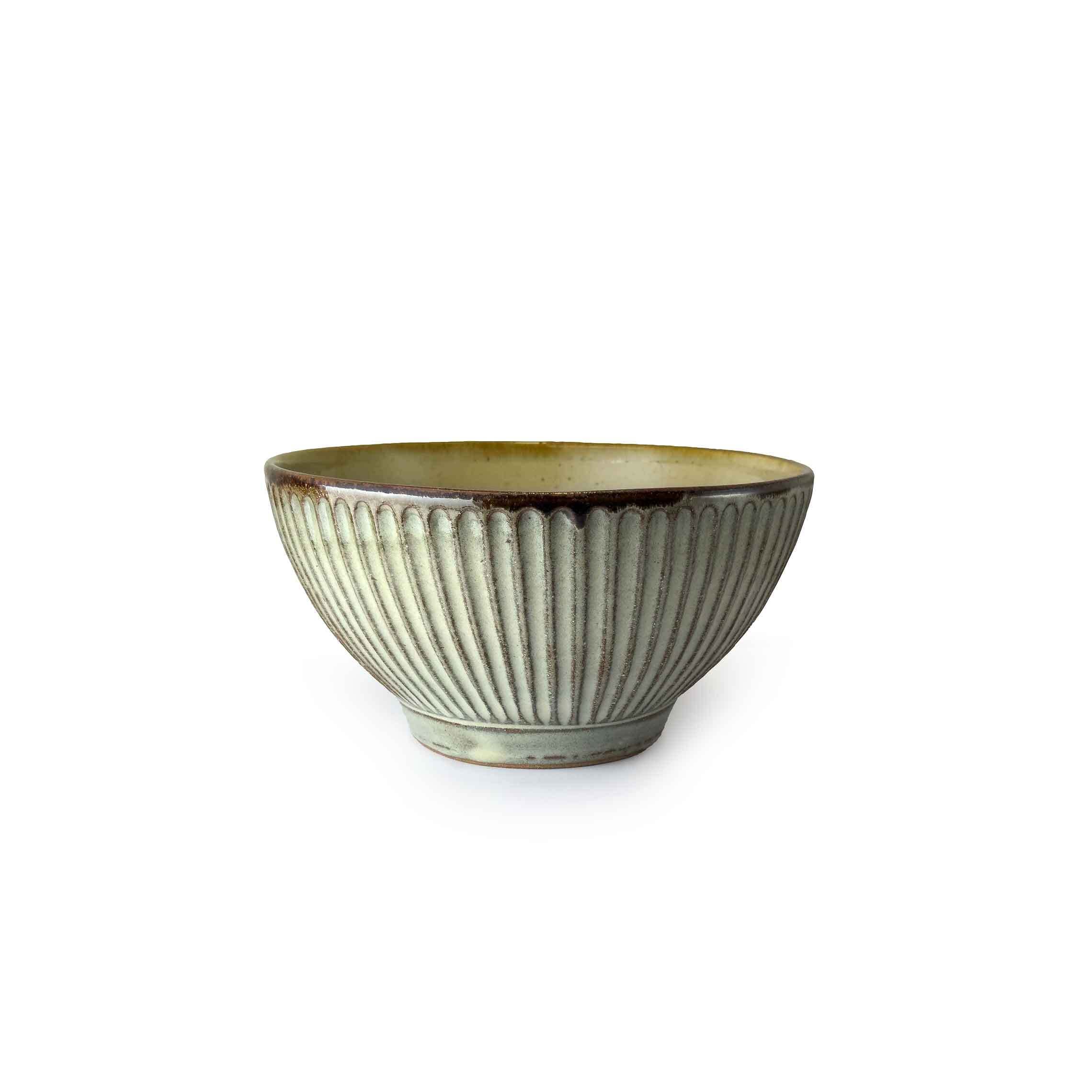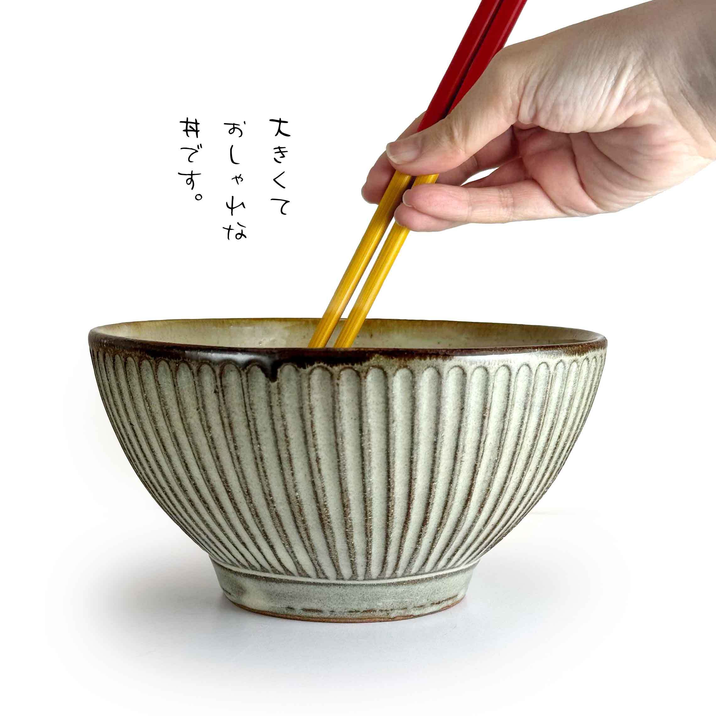 外側の縦の削り模様(しのぎ)が落ち着いた雰囲気で、和食にも洋食にも合う「ナチュラル系のモダンデザイン」な丼です。