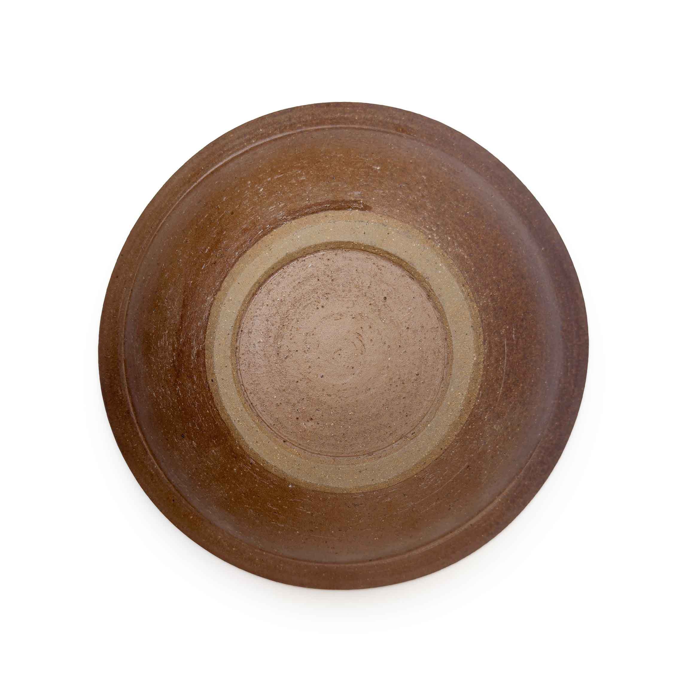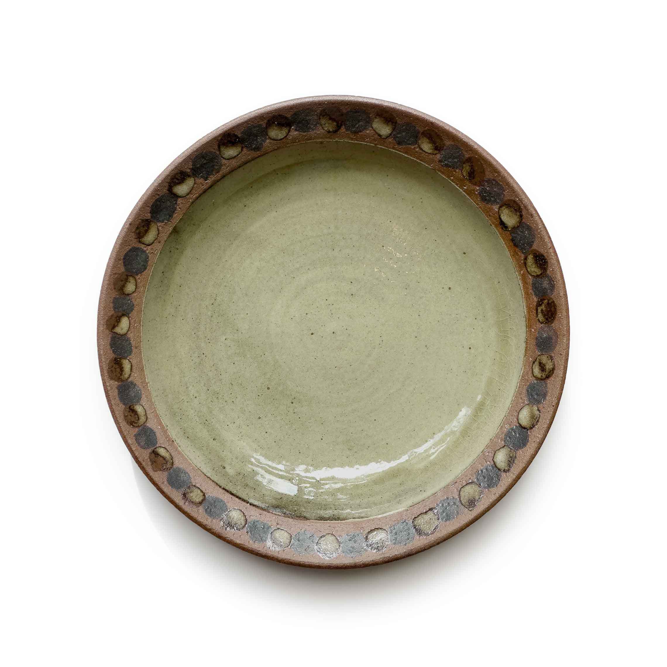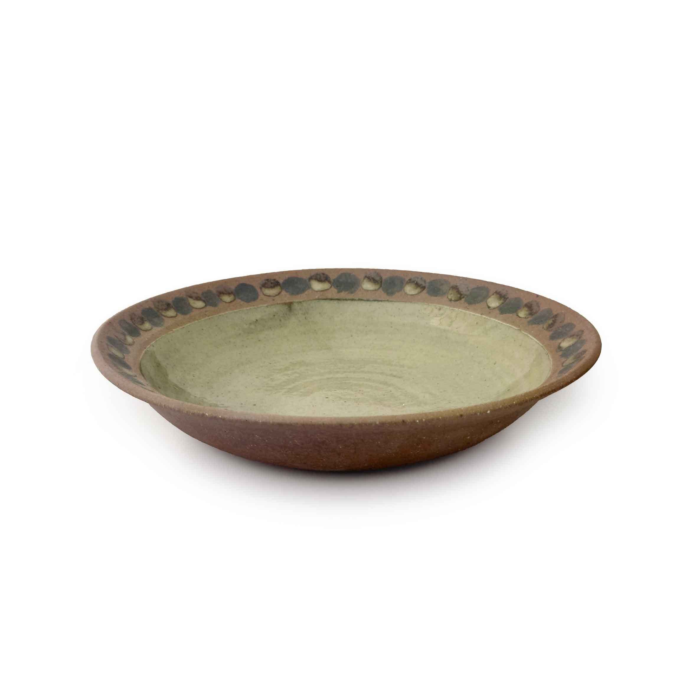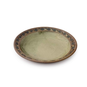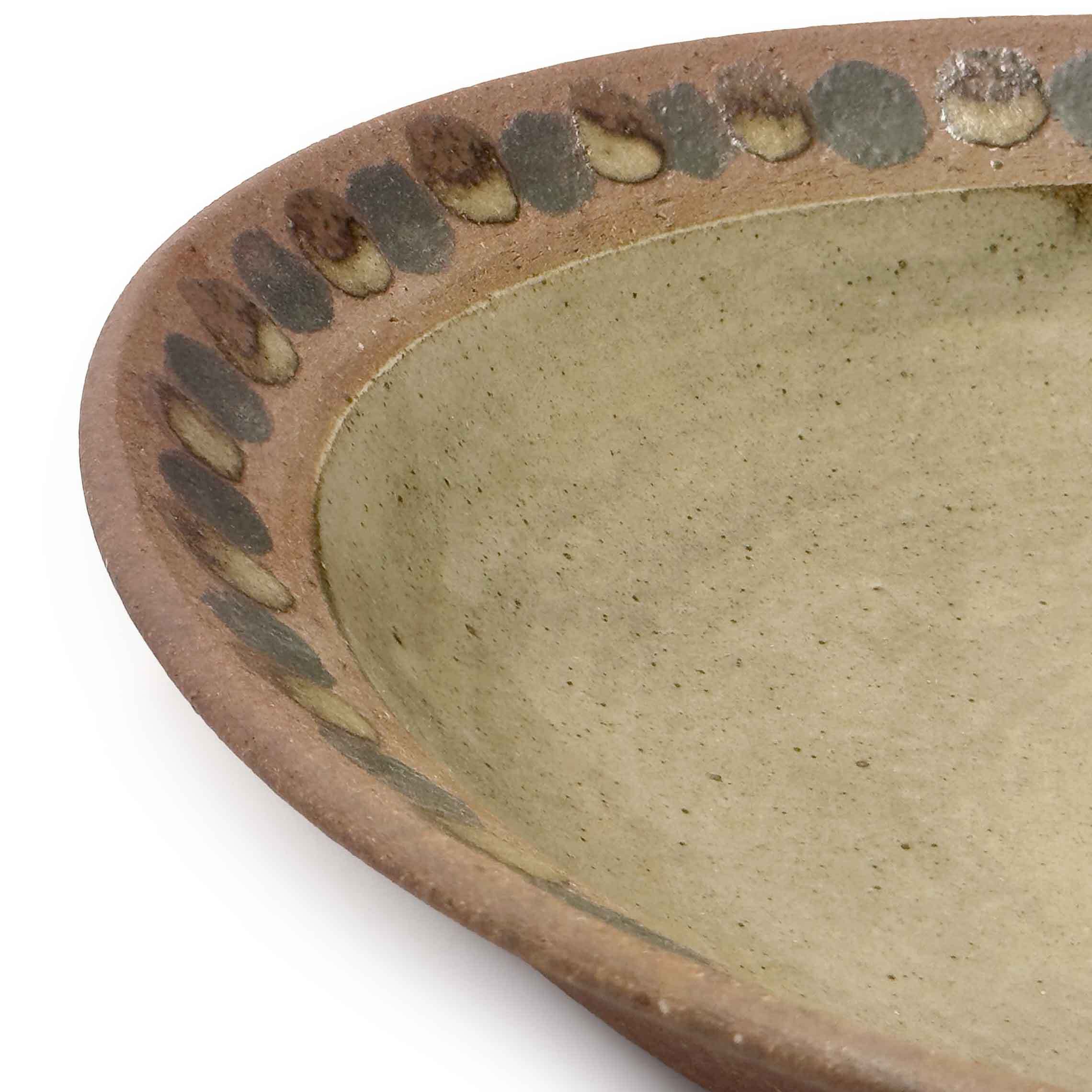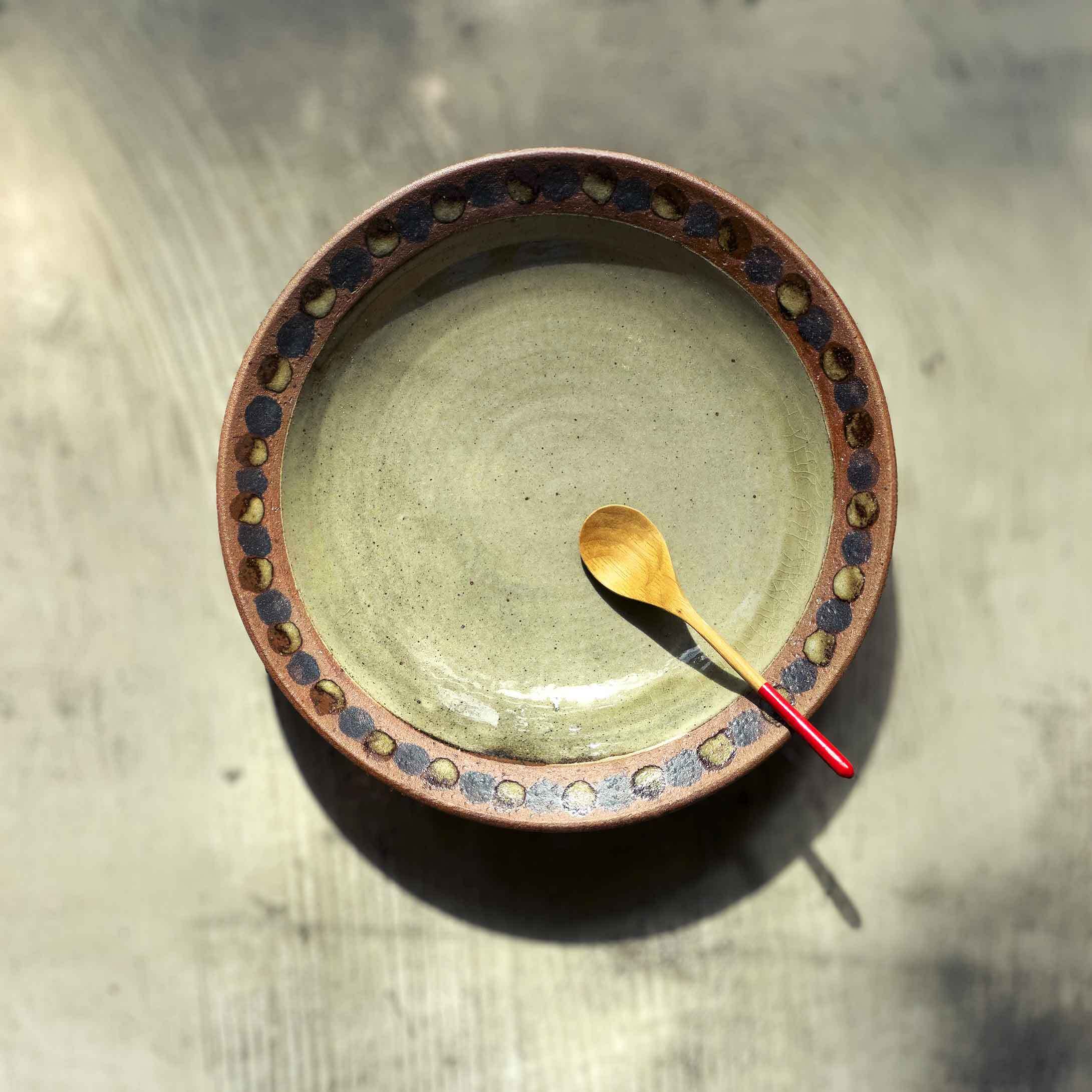 縁は赤土の地が見え、そこに丸点模様が規則正しく並んでいて、ややポップさも感じます。
