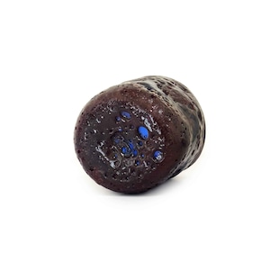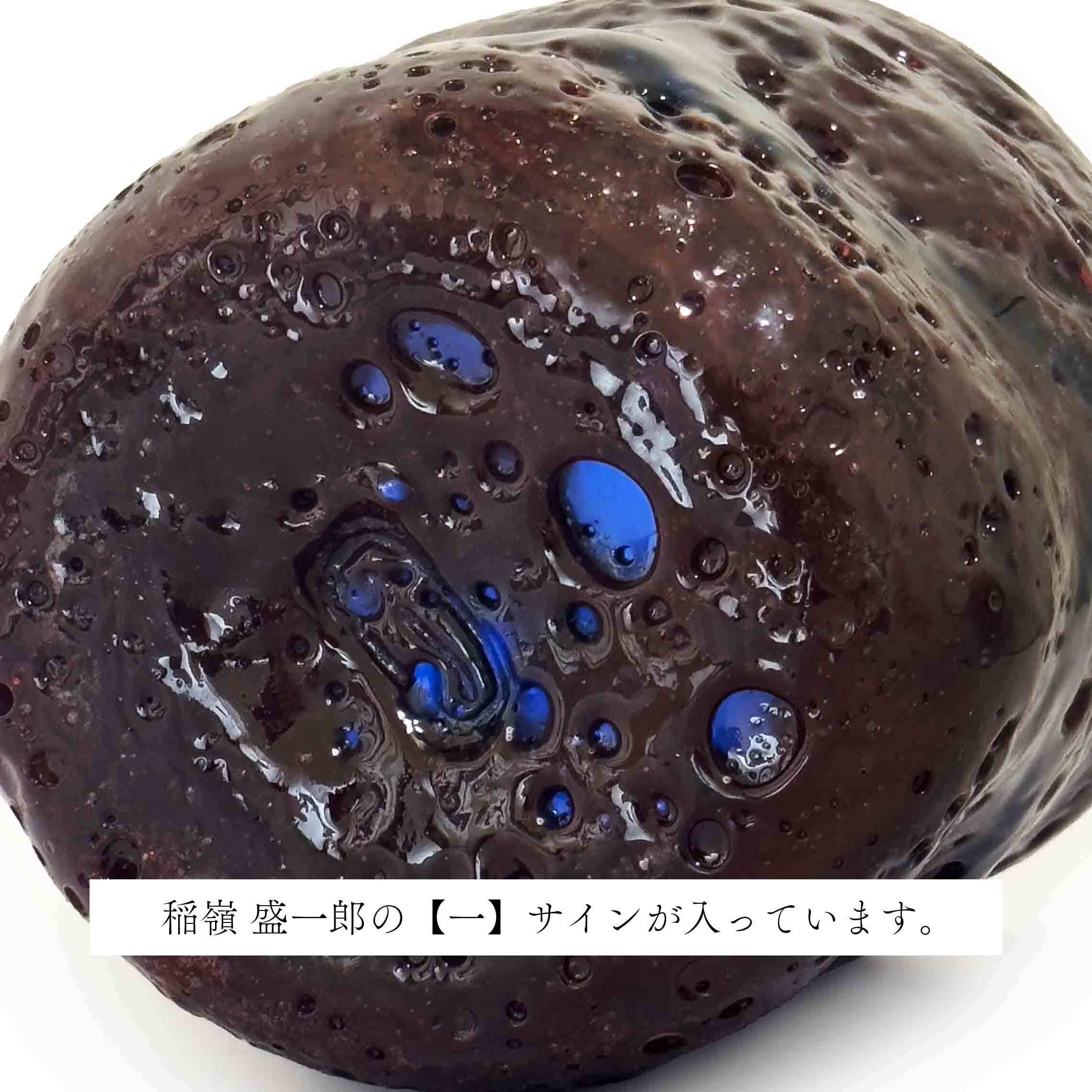 表面には気泡や凹凸があり、溶岩や鉱石のような荒々しさとガラス特有の艶やかさが同居しています。