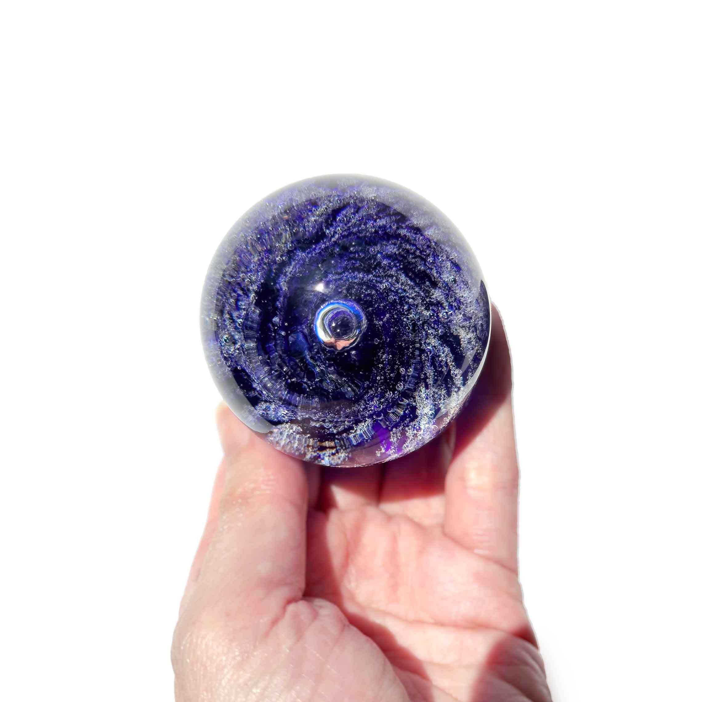 深い藍色の中に、星のような気泡が渦を巻くガラスのペーパーウェイト。