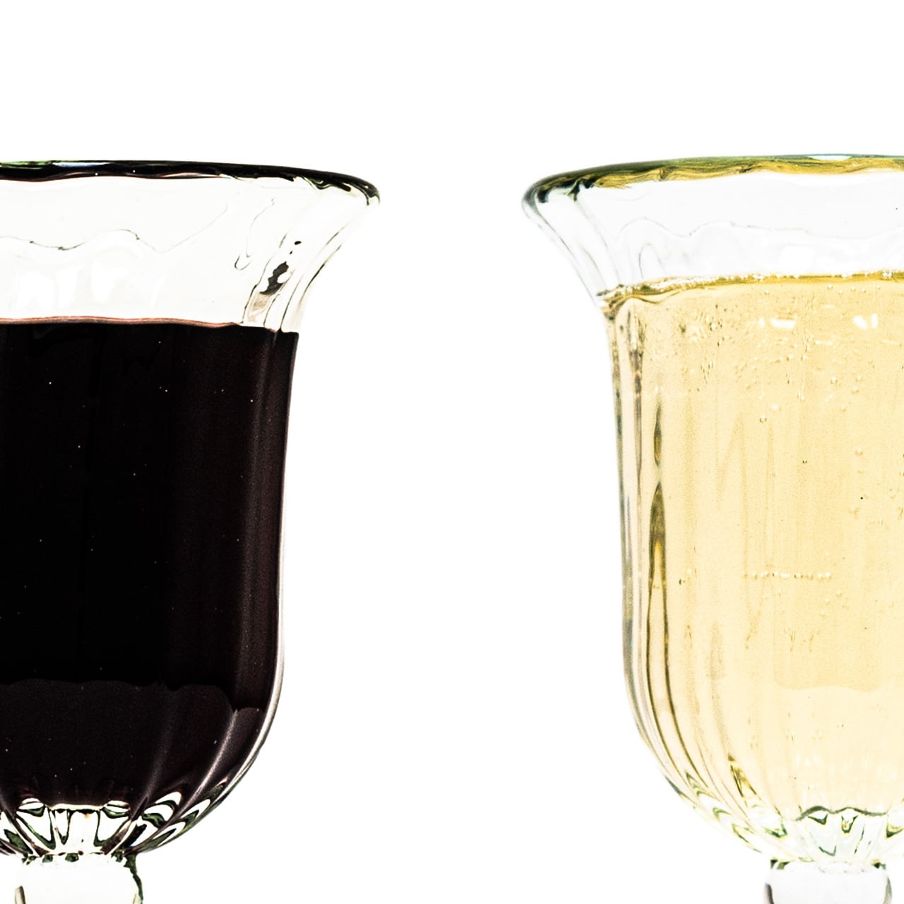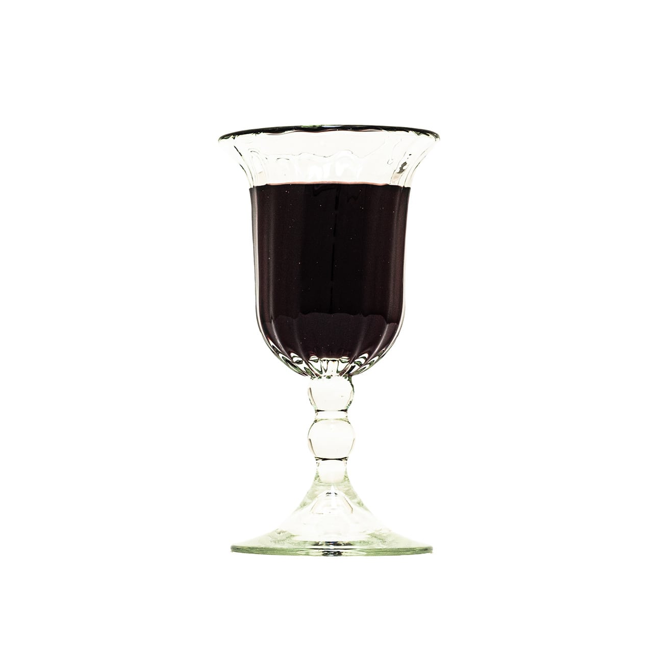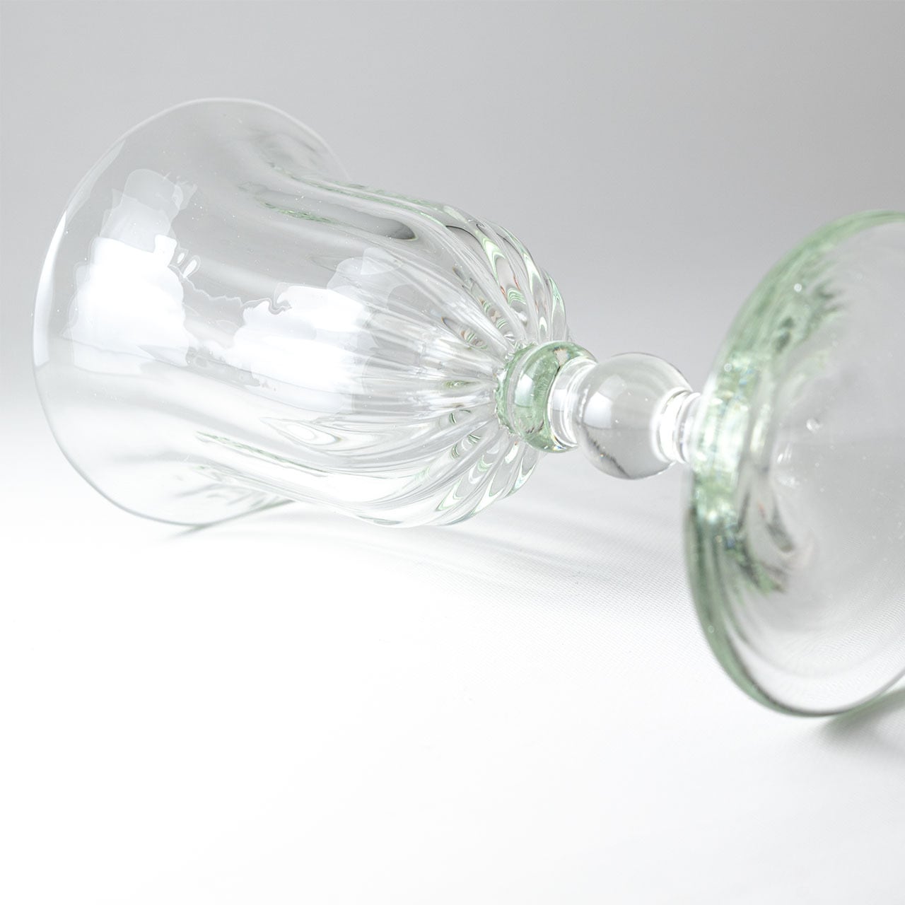 縦に流れるモール模様と個性的なフォルムのステムが印象的なワイングラス。