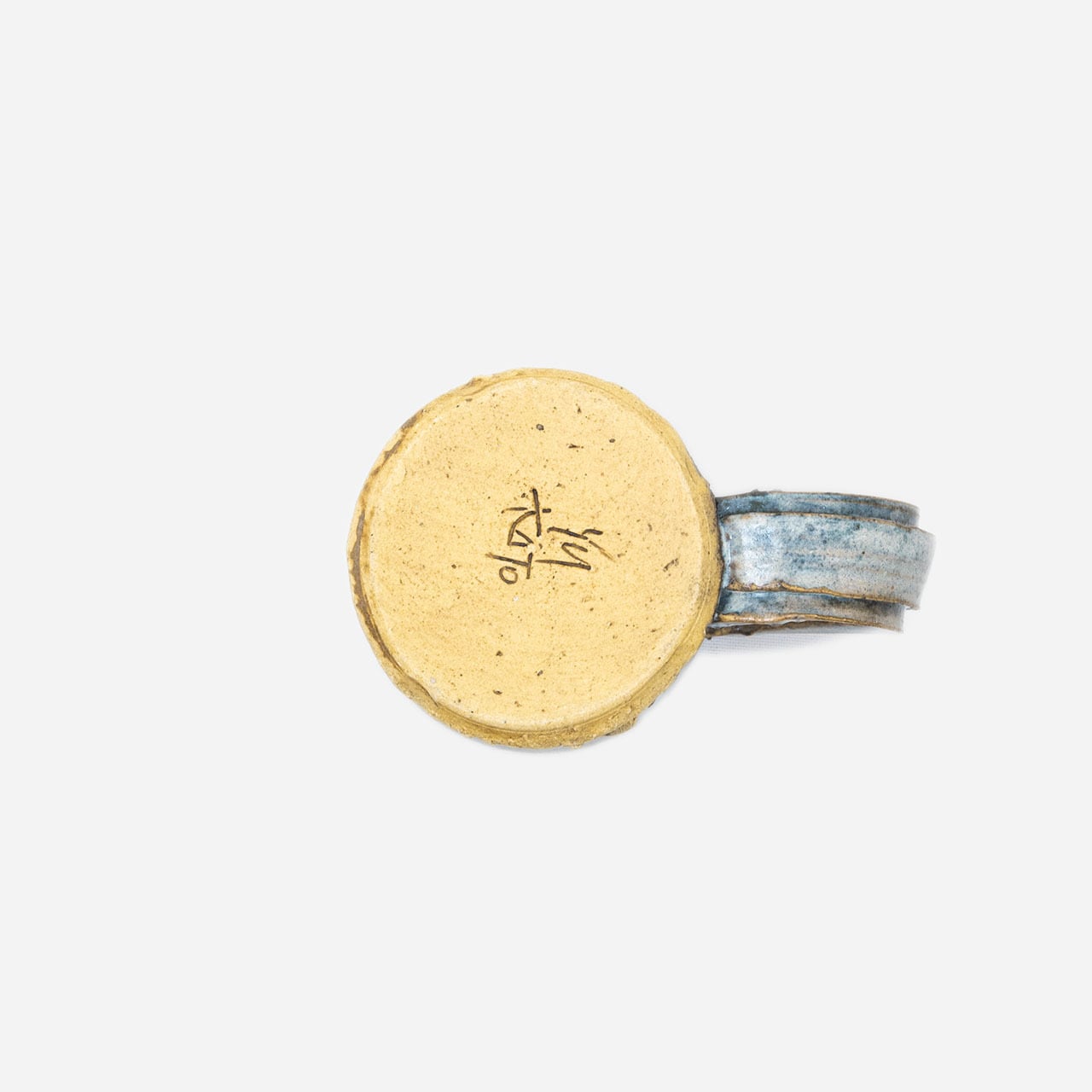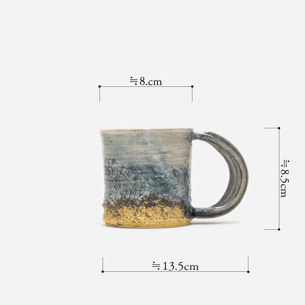 淡い色合いと土の粗さが、ナチュラルな印象のマグカップ。持ちてのデザインも目を引きます。