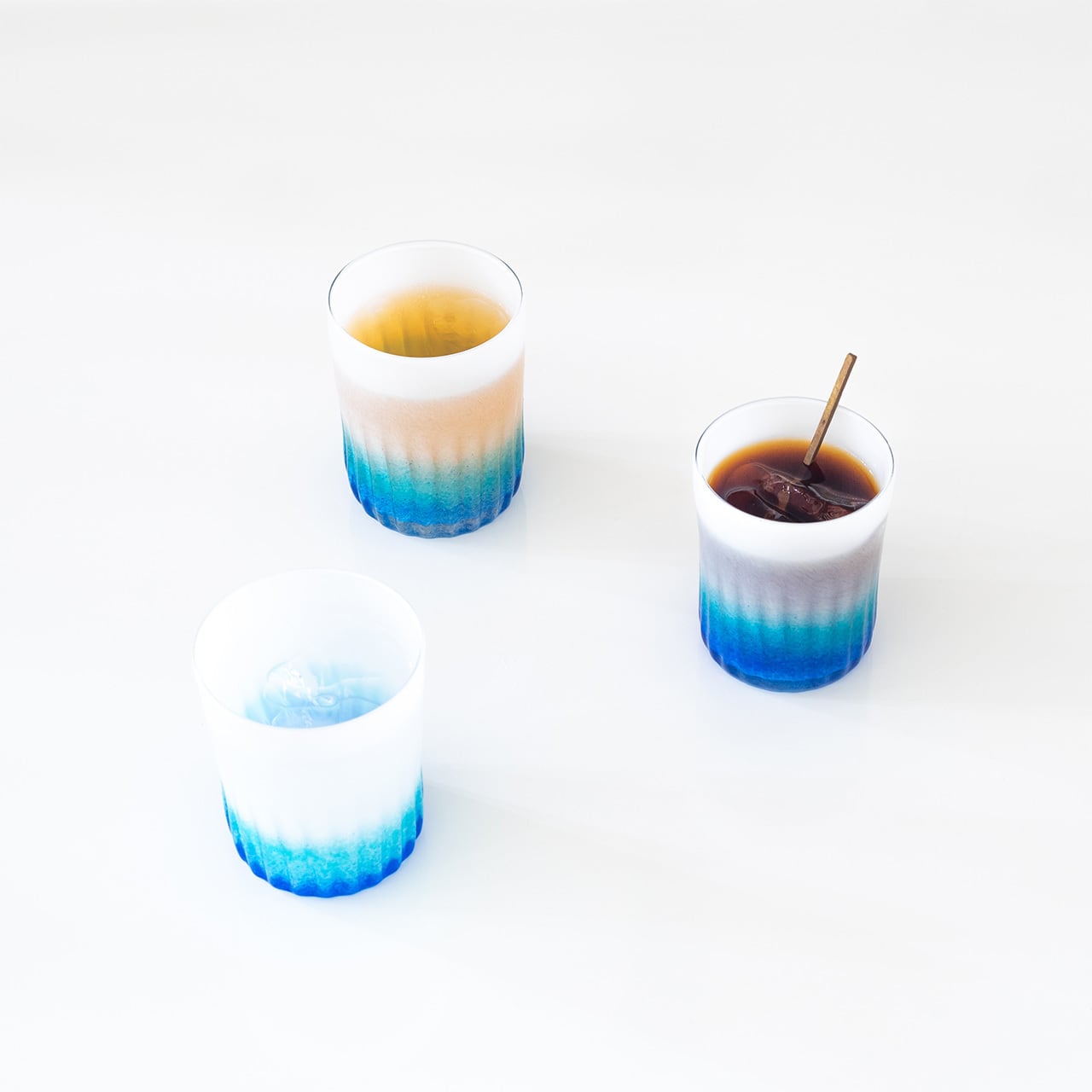 グラスを白くすることで注ぐ飲み物の色が透けるのを抑え、色の濃いコーヒーを入れてもグラスの表情が極端に変化することが少ないため、いつでも「沖縄の海」を想い起こすことができます。