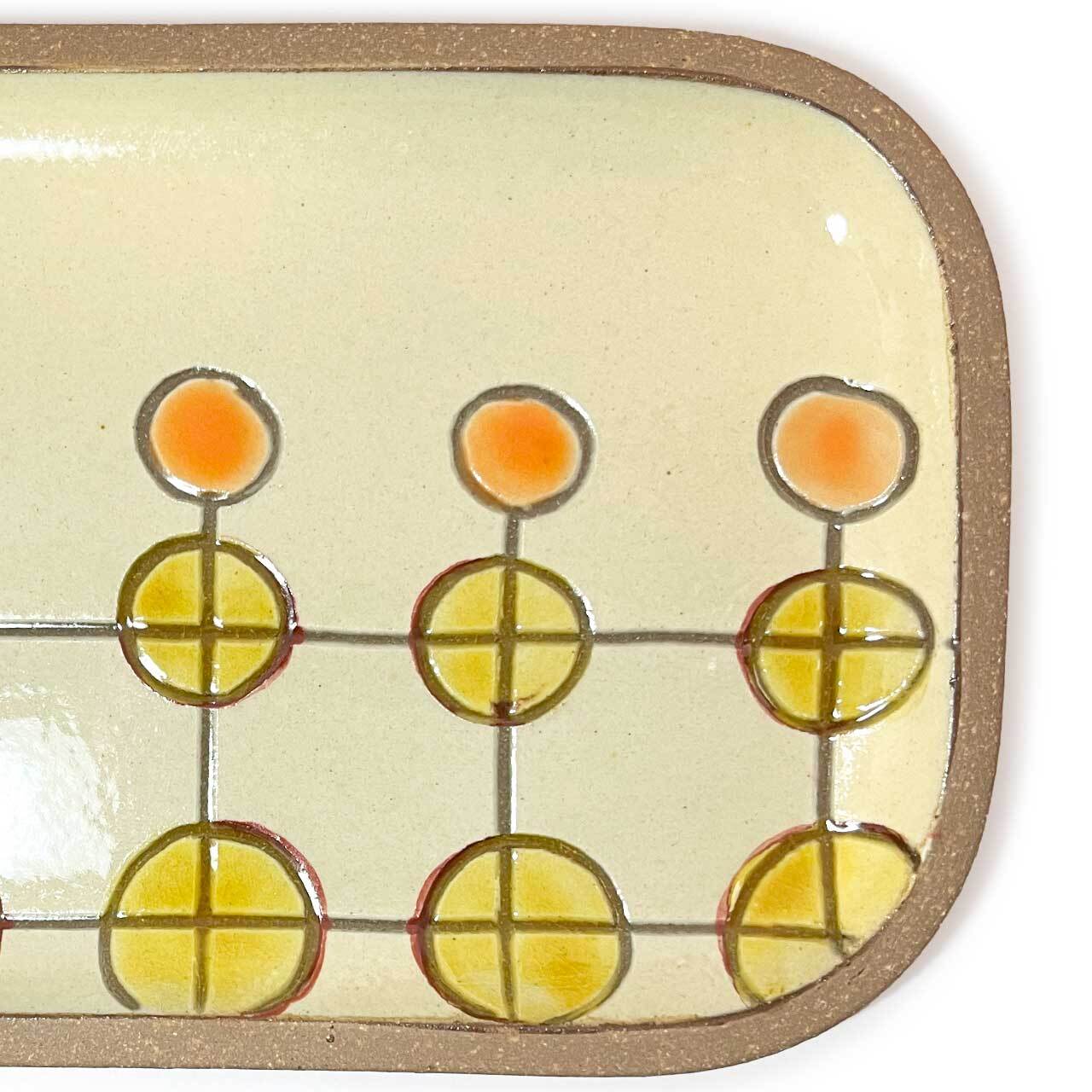 チェルシーは、オレンジと黄色とクリーム色の配色に、円とラインが重なったデザインが施された、レトロ感のある器です。