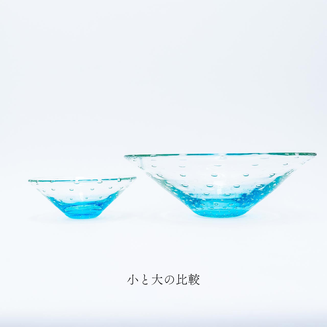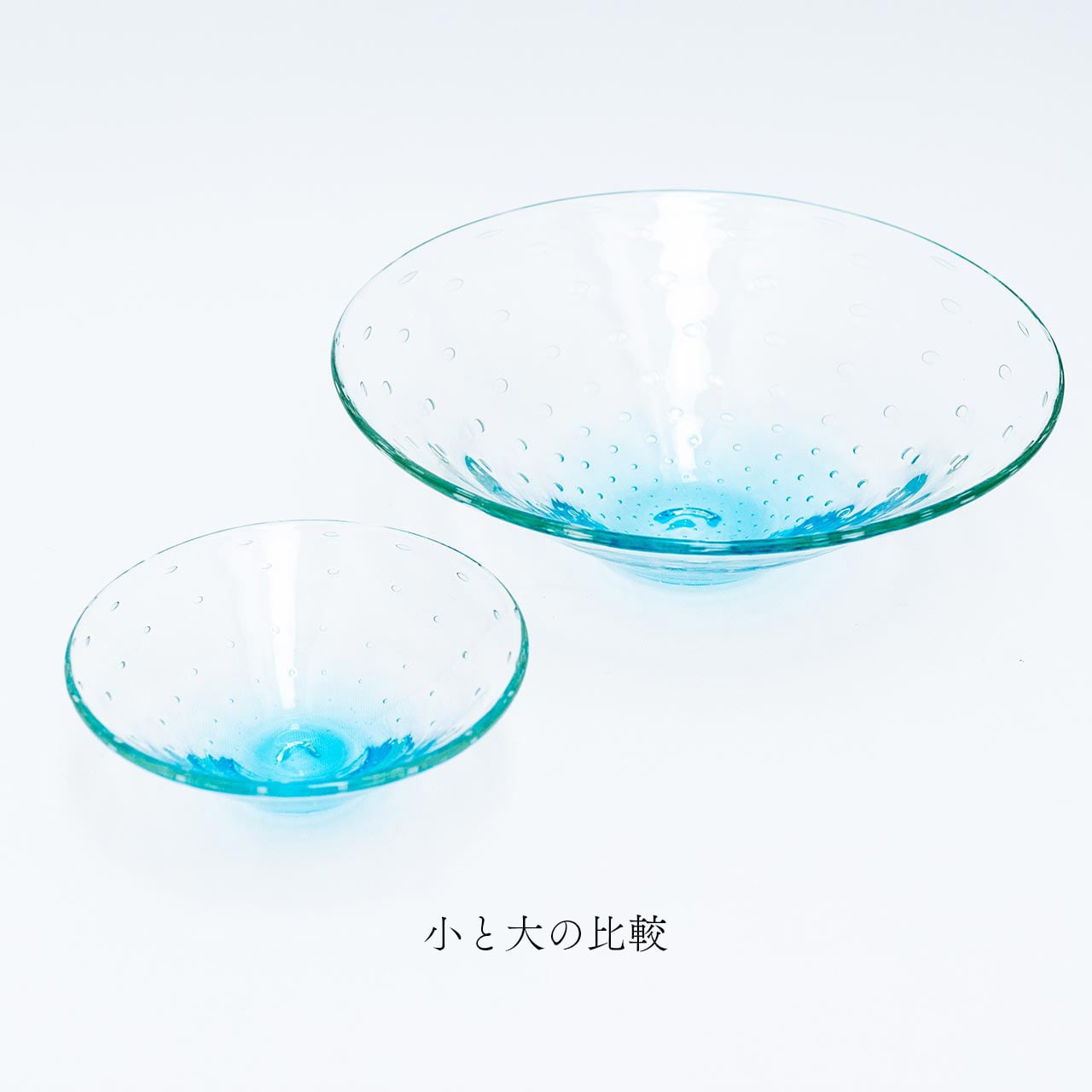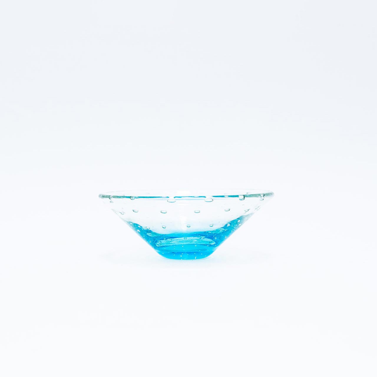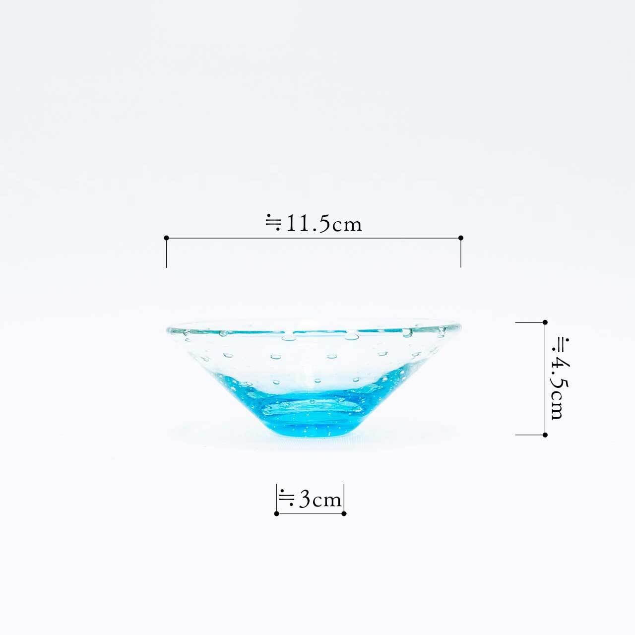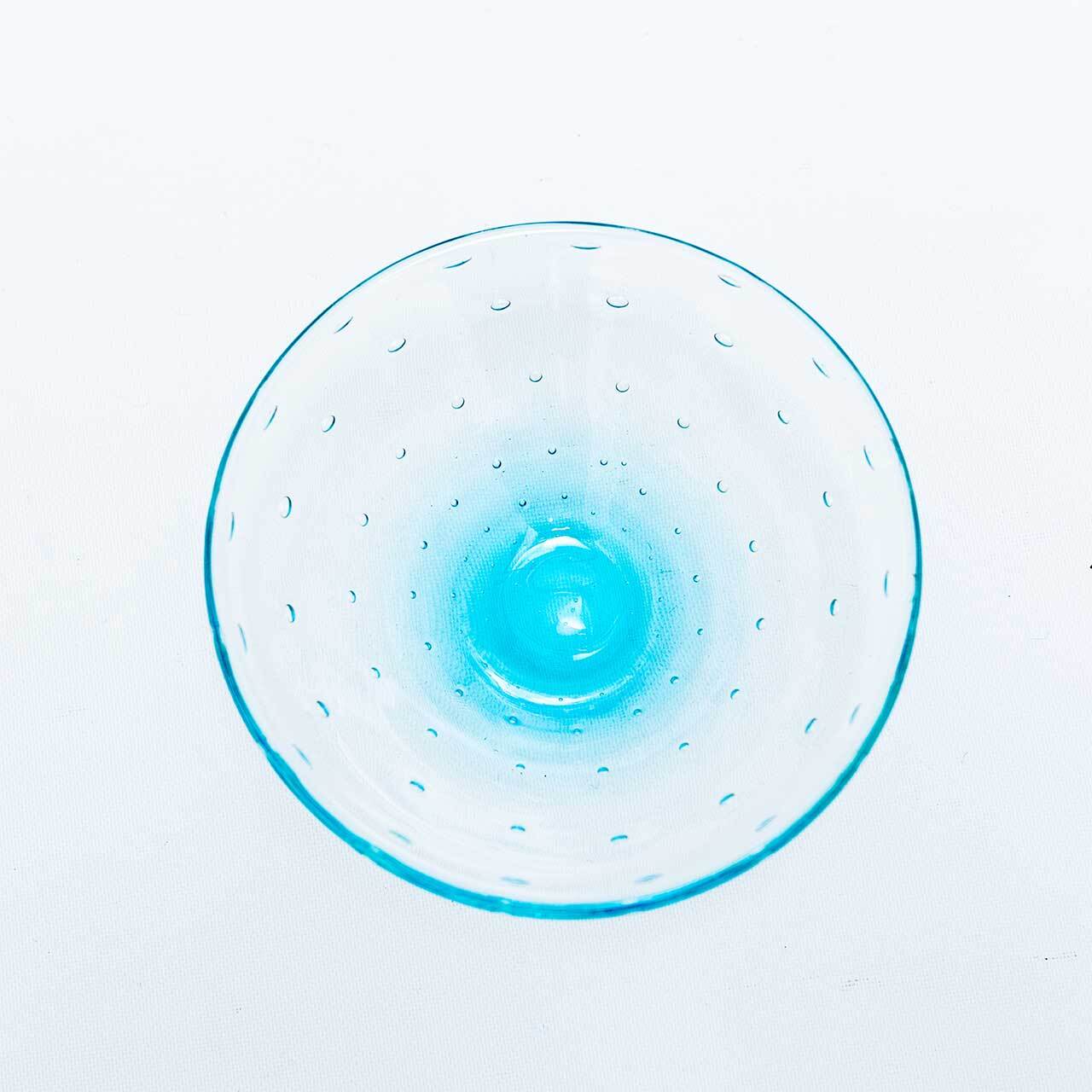 底に色づく水色が透明な上部にも淡く反射する、瑞々しく美しい器です。